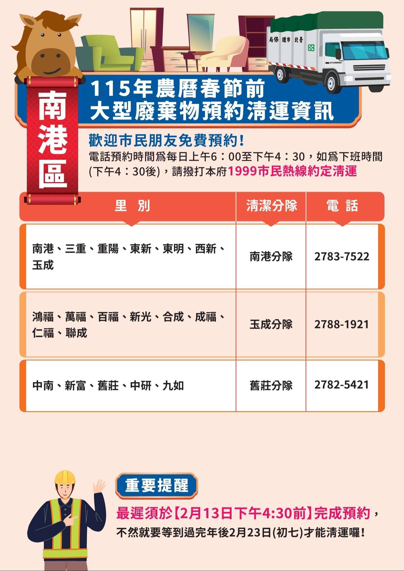 115年春節期間垃圾清運方式(115年2月9日至115年2月22日止):