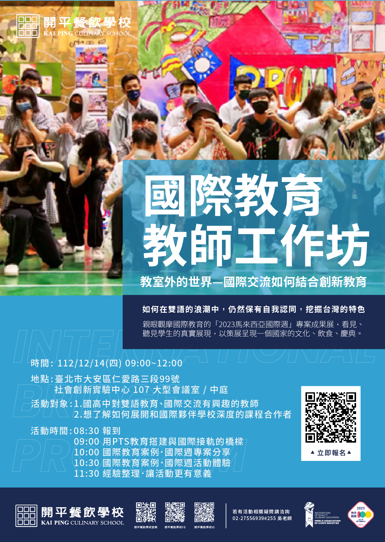 一、協助國中教師認識技職體系之學習內容、教學特色及進路發展。本次工作坊融入「國際教育」,其透過「2023馬來西亞國際週」專案成果展及課程研討多年來國際部教師如何與各國姐妹校展開交流與深度合作,並看見、聽見學生的真實展現,更加了解技職體系,進而發揮協助學生適性就學選擇之輔導。
