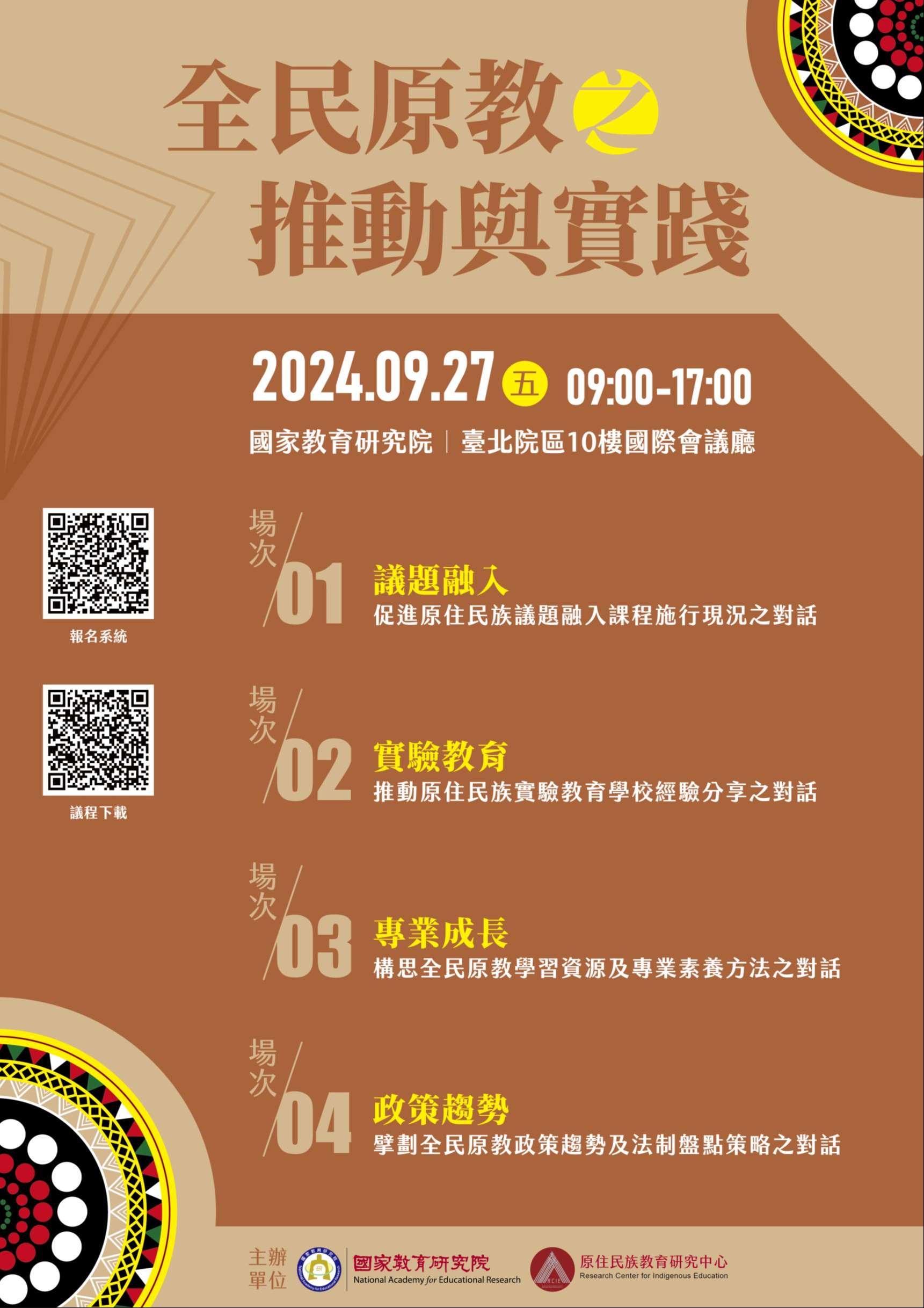 一、本次研討會主題為「全民原教之推動與實踐」,邀請全民 原教領域相關學者專家、長官、各級學校教育人員,以及 對教育、教學、教材及課程發展有興趣的民眾,針對「議 題融入-促進原住民族議題融入課程施行現況之對話」、 「實驗教育-推動原住民族實驗教育學校經驗分享之對 話」、「專業成長-構思全民原教學習資源及專業素養方 法之對話」及「政策趨勢-擘劃全民原教政策趨勢及法制 盤點策略之對話」等4項子題進行討論。