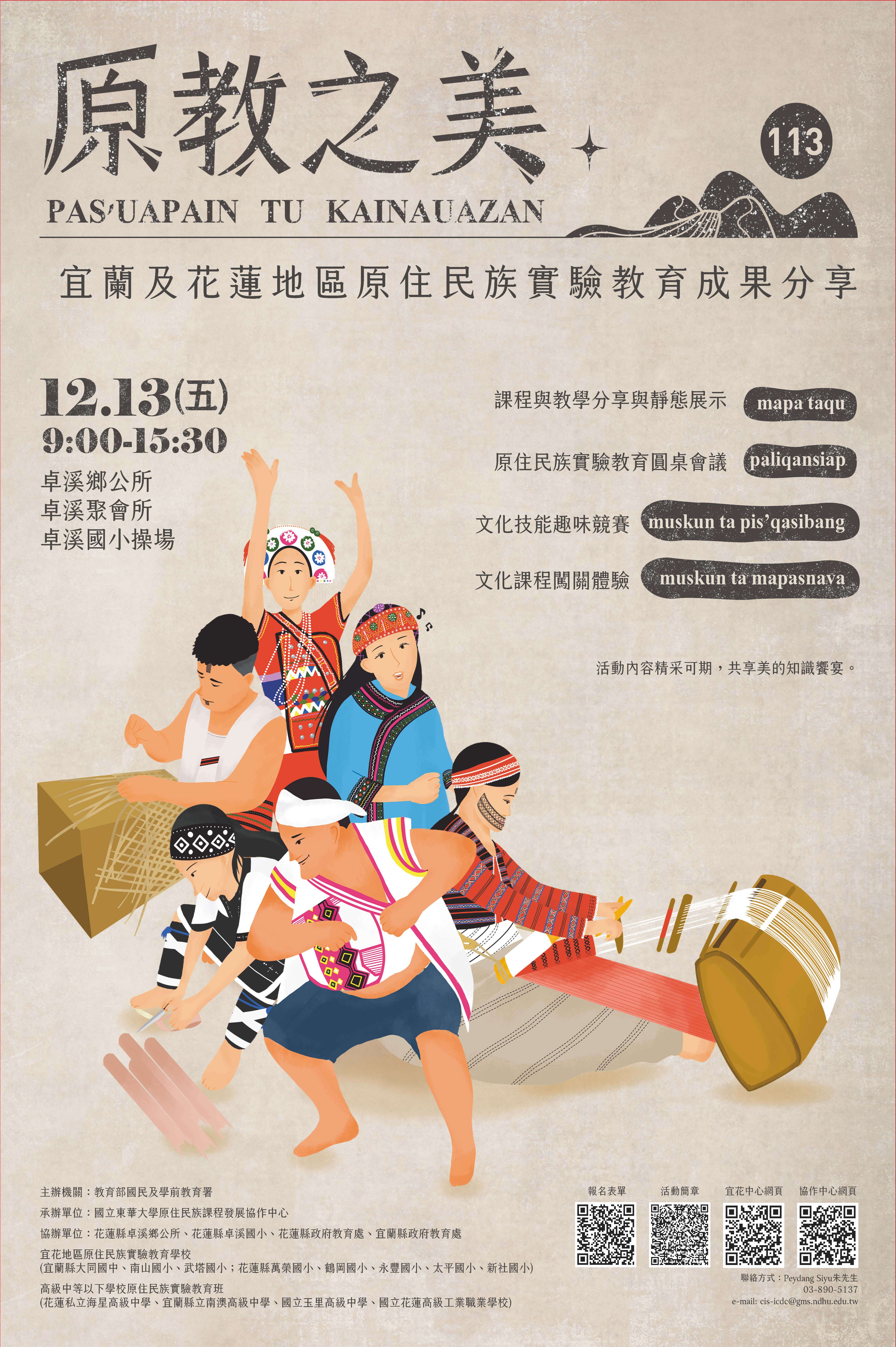 二、旨揭活動係由宜蘭及花蓮地區原住民族實驗學校進行課 程、教學與學生學習成果分享,並透過文化課程體驗活動 之方式,期能促進與會人員對於原住民族實驗教育有更為 深入之理解,盼創造聚焦、交流及多元對話的機會,提供 相互參照與學習的平台。