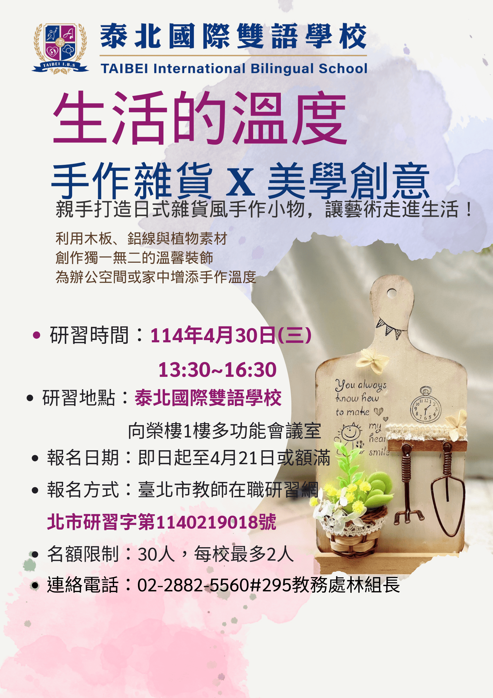 1、研習名稱:手作工藝在生活美學的應用-生活的溫度: 手作雜貨 X 美學創意。