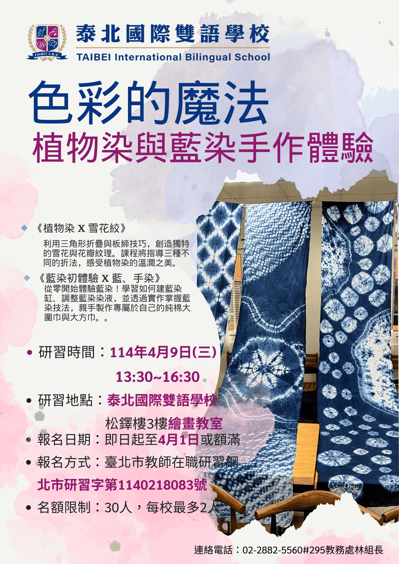 1、研習名稱:染布工藝在生活美學的應用-色彩的魔法: 植物染與藍染手作體驗。