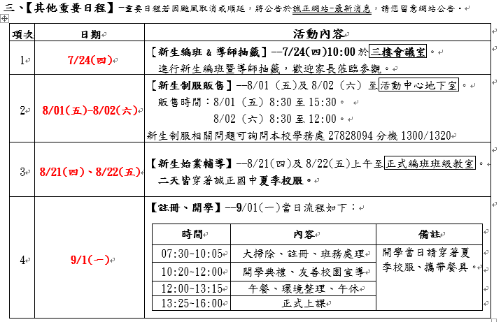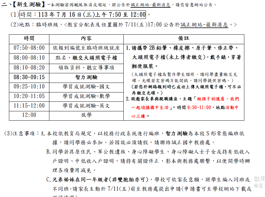 1. 請於7月16日上午7點50分到校參加新生測驗