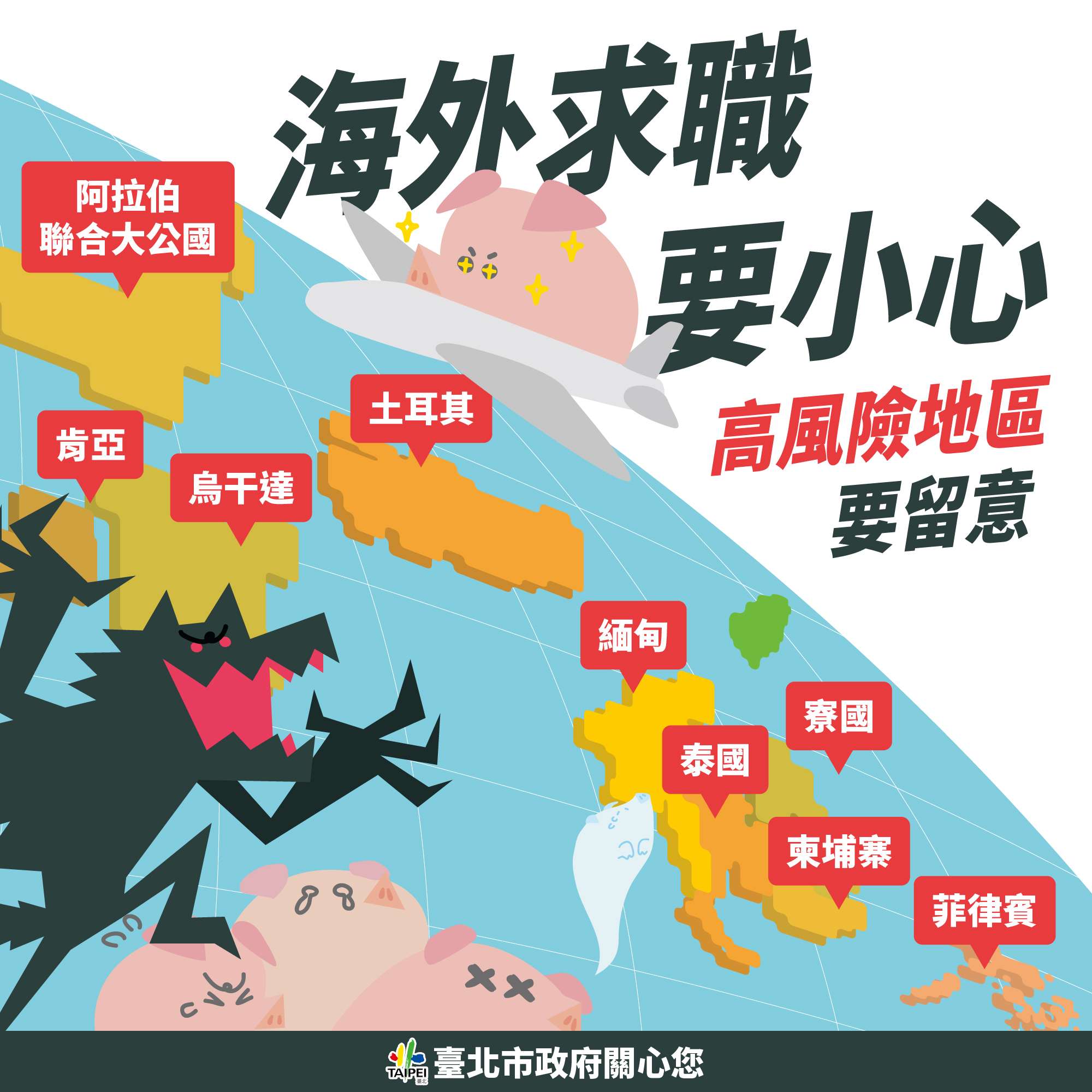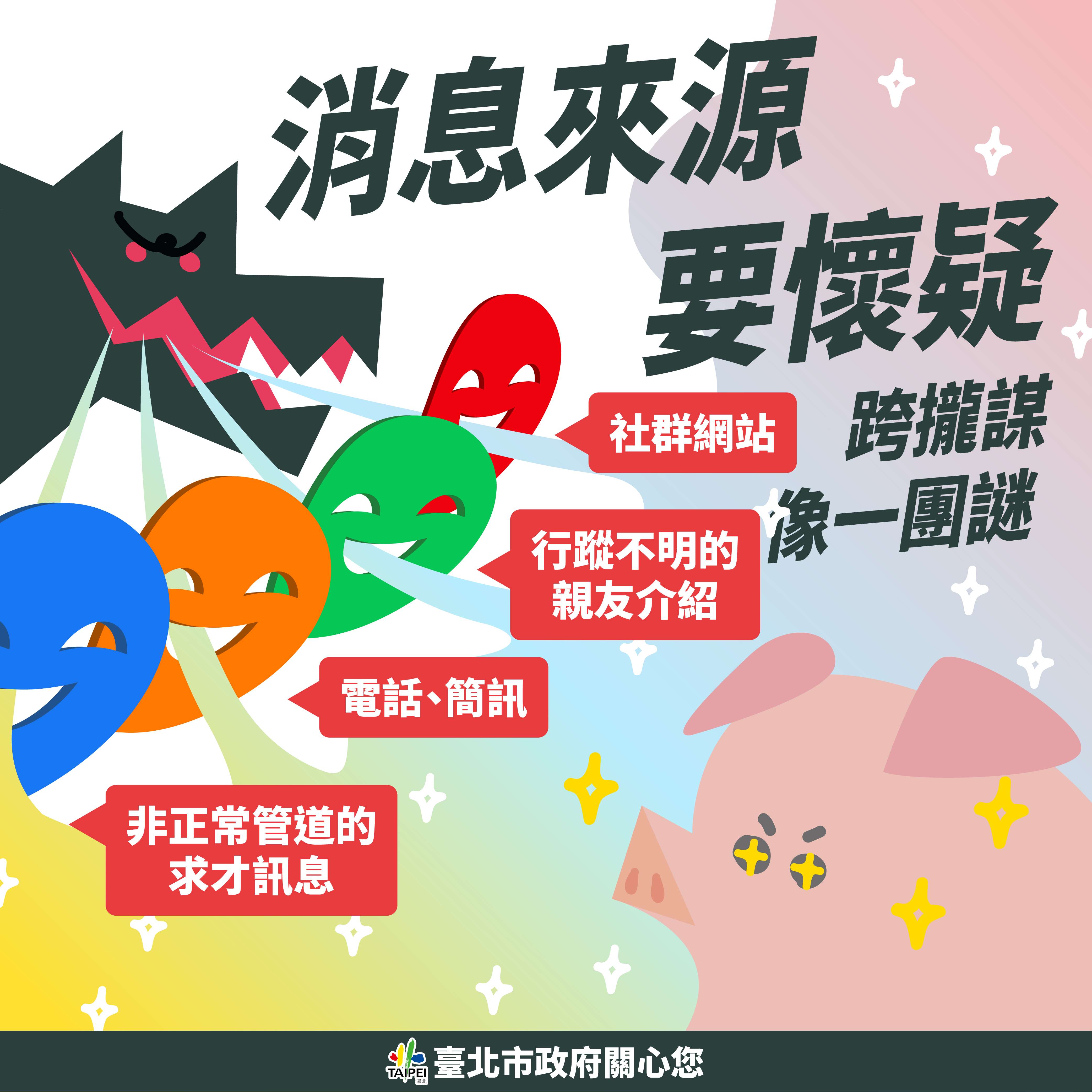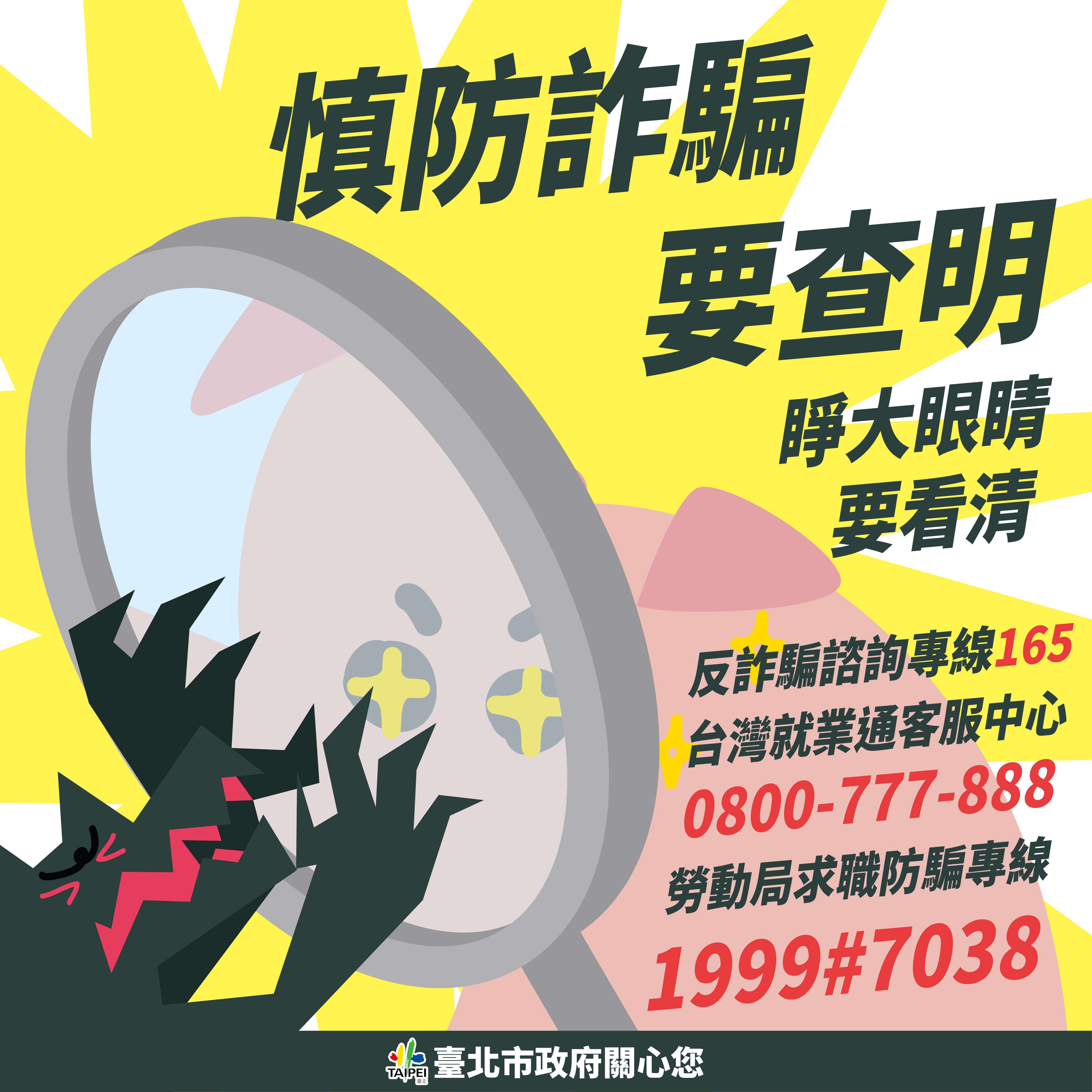 二、近期海外求職詐騙事件頻傳,為加強市民自我保護意識, 請本局所屬各機關及學校協助公告並推播附件懶人包至所 屬媒體平臺(如:官方臉書粉絲專頁、IG、Line群組及電 子看板等),俾利提升民眾、學校師生及家長防詐知能。