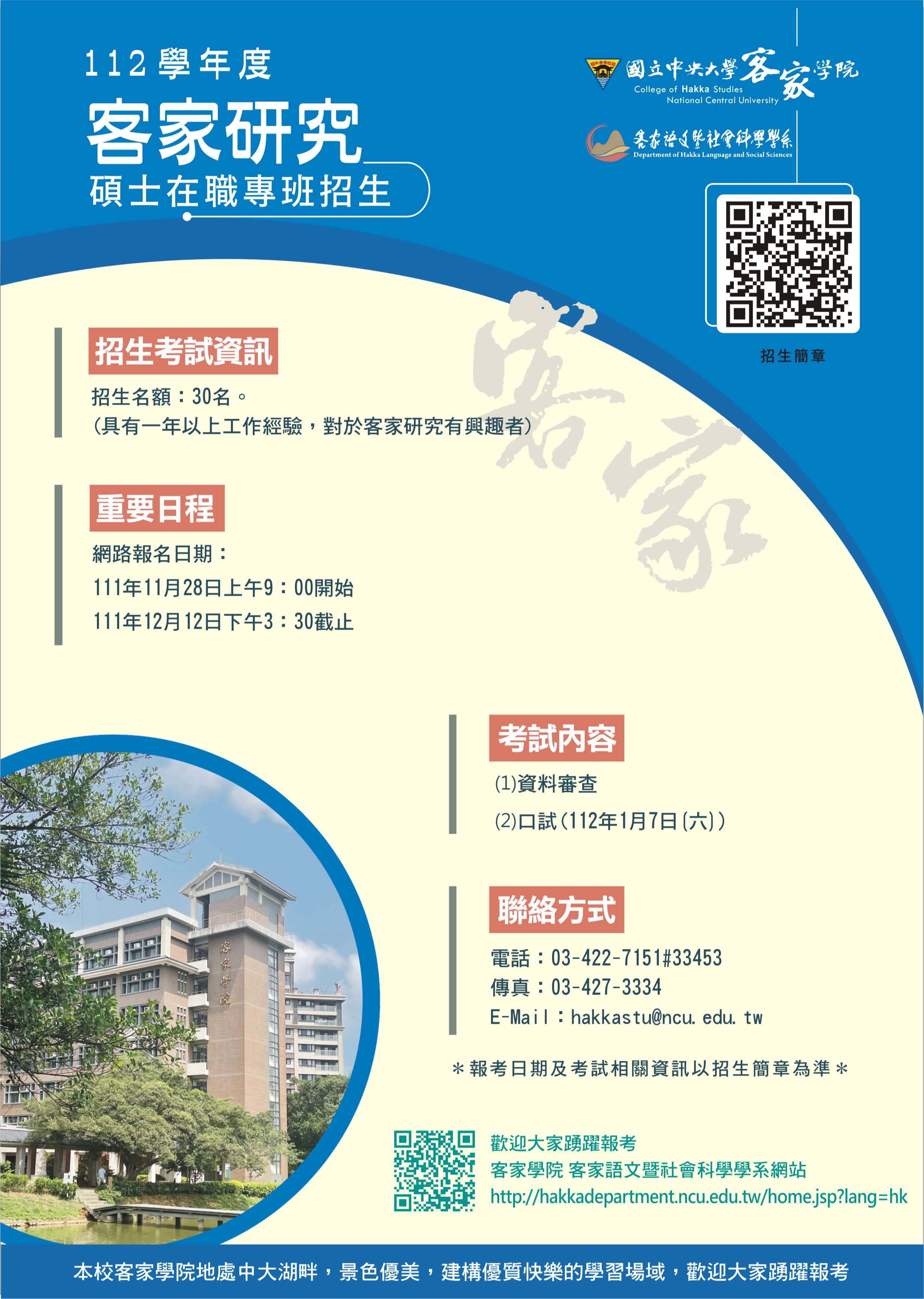 一、本校客家語文暨社會科學學系「客家研究碩士在職專班」 112學年度招生,考試內容為:資料審查(免筆試)及口試, 招生海報如附件。