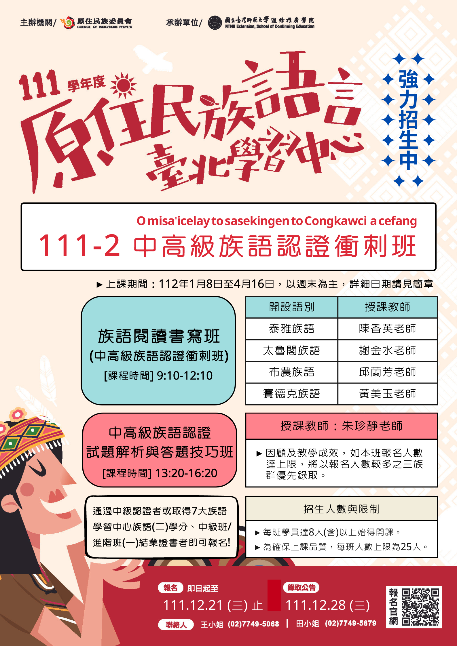 二、旨揭專班招生對象針對有意願學習原住民族文化及語言, 並欲參加中高級族語認證考試者。