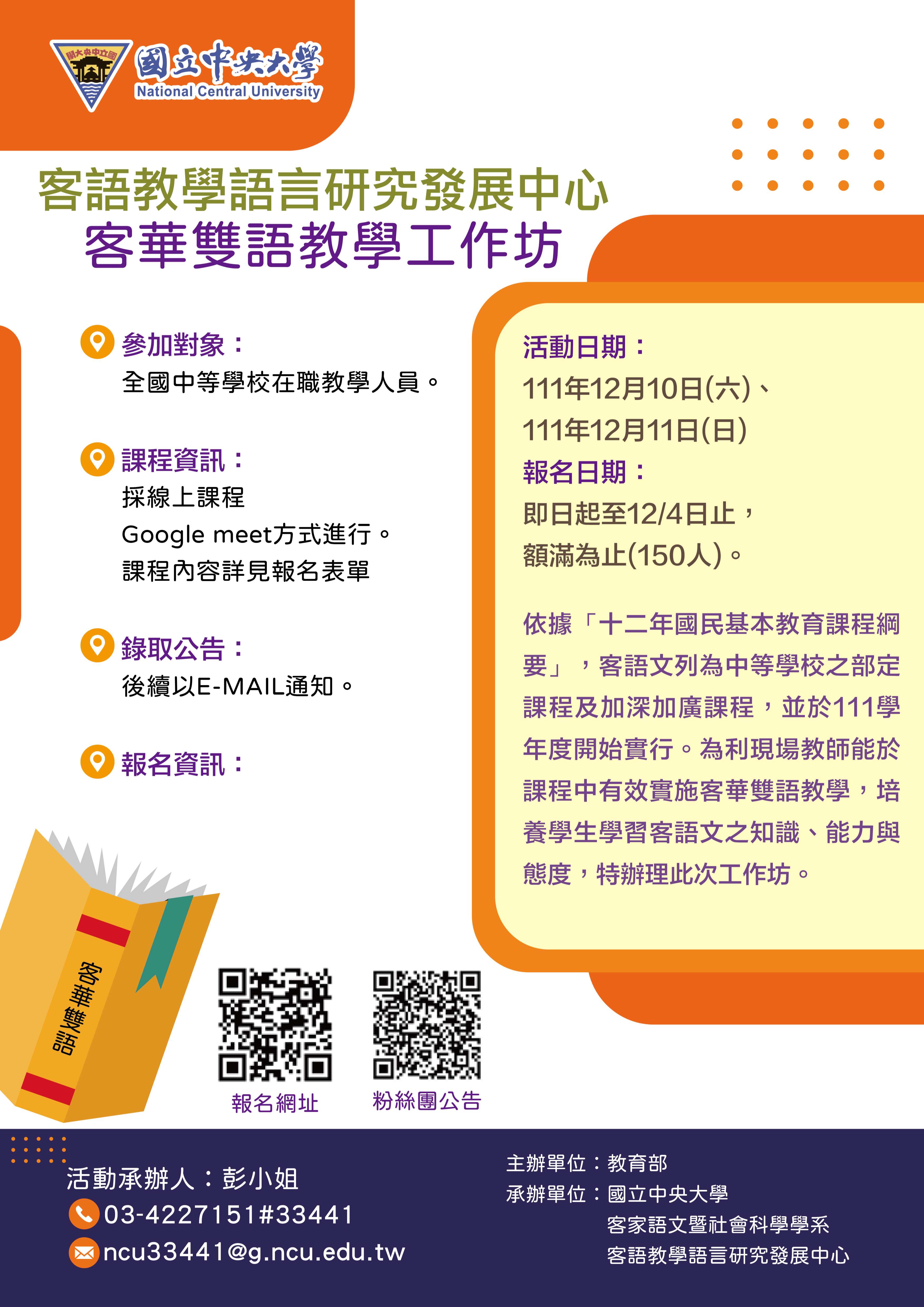三、倘對本活動有相關疑問,請逕洽國立中央大學彭小姐,電話:03-4227151分機33441;電子信箱:ncu33441@g.ncu. edu.tw。