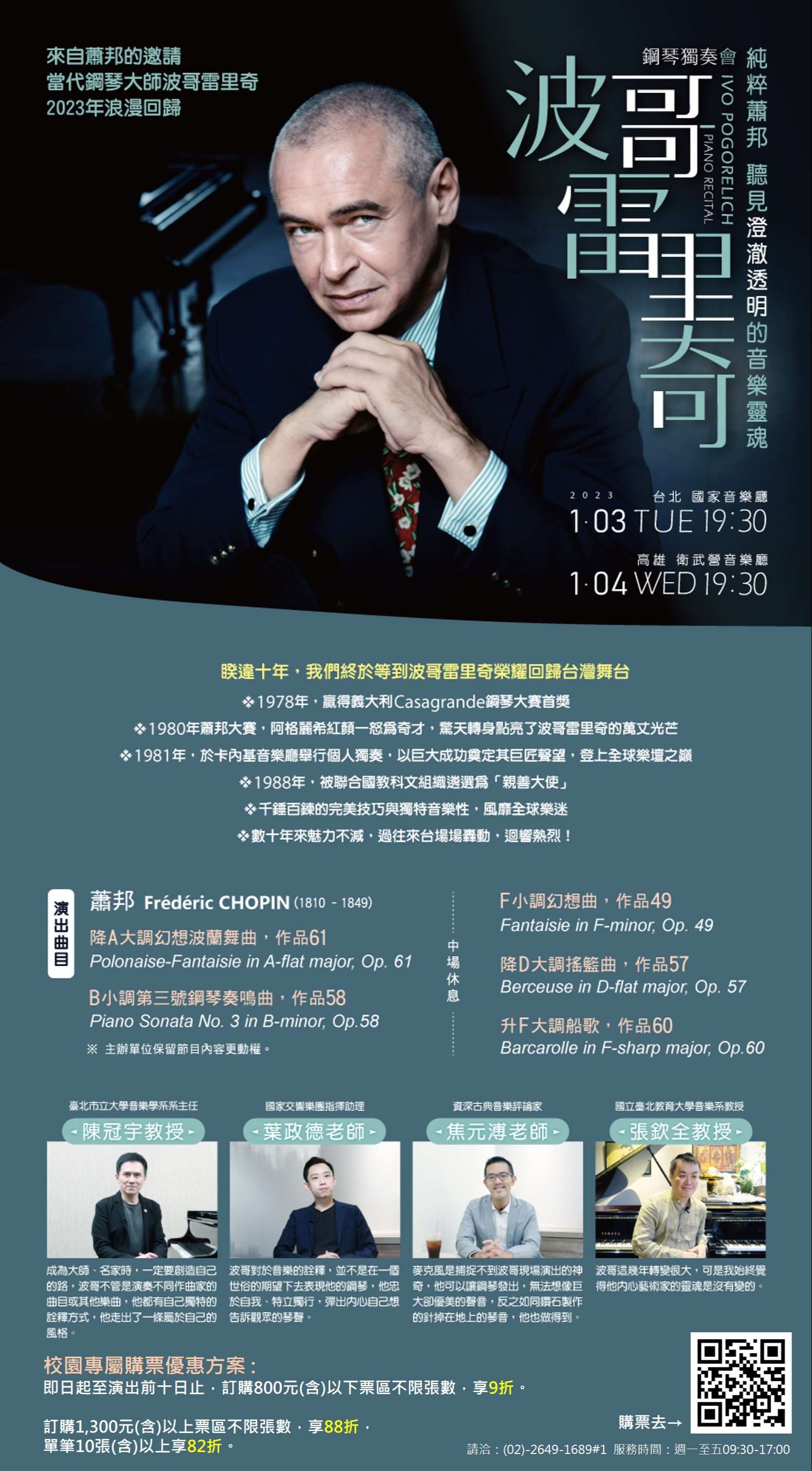 112年1月3日(周二)起至112年1月4日(周三)分別於臺北國家音樂廳、高雄衛武營國家音樂廳舉辦《波哥雷里奇》鋼琴獨奏會,歡迎蒞臨參與!