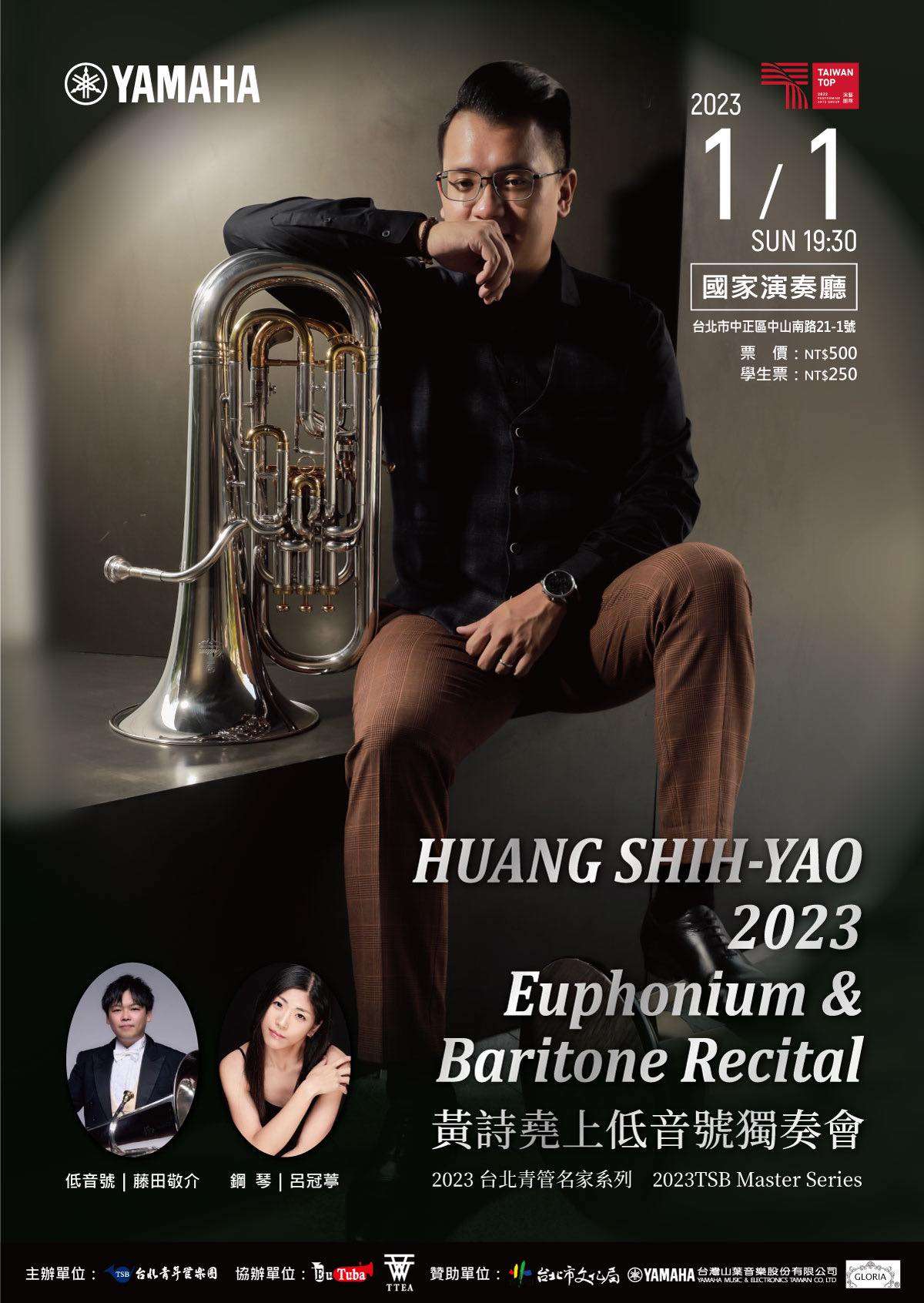2023台北青管名家系列,邀請臺南藝術大學音樂系上低音號講師黃詩堯,攜手留德鋼琴家呂冠葶,國家交響樂團低音號首席藤田敬介帶來一連串華麗炫技的樂曲。
