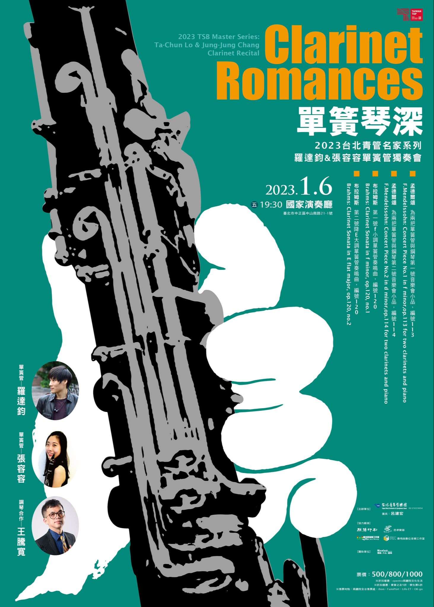 2023台北青管名家系列,邀請台北青管2團首席單簧管羅達鈞,與留法單簧管演奏家張容容擔綱獨奏,演奏布拉姆斯2首單簧管奏鳴曲、與孟德爾頌單簧管2重奏與鋼琴2首音樂會演奏曲,讓您深入認識單簧管音樂美好