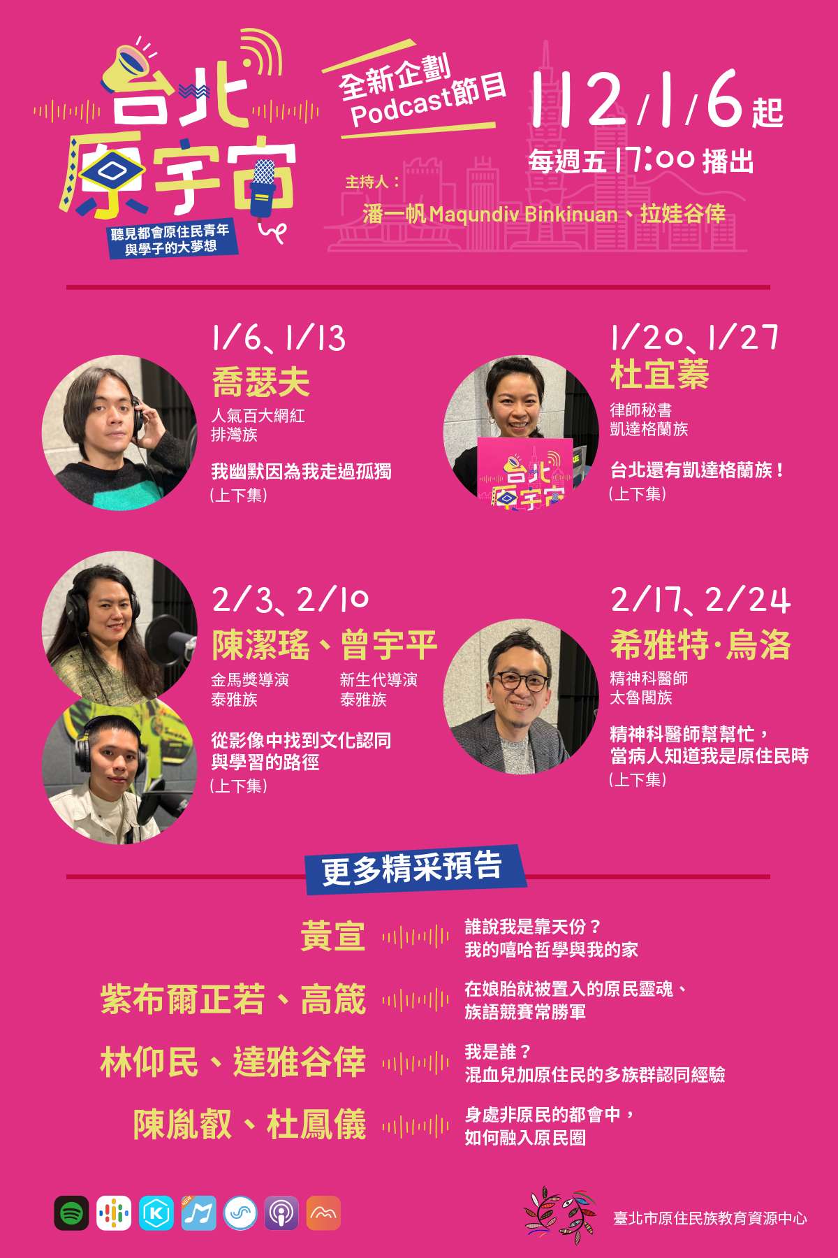 一、為擴大都會區原住民年輕學子在求學期間及社會適應之正面影響力,本中心製作「台北原宇宙-Podcast節目」(以下簡稱本節目),訪談臺北市原住民青年學子成長學習經驗, 並以輕鬆逗趣的故事分享,帶出感動人心的正向思考能量。