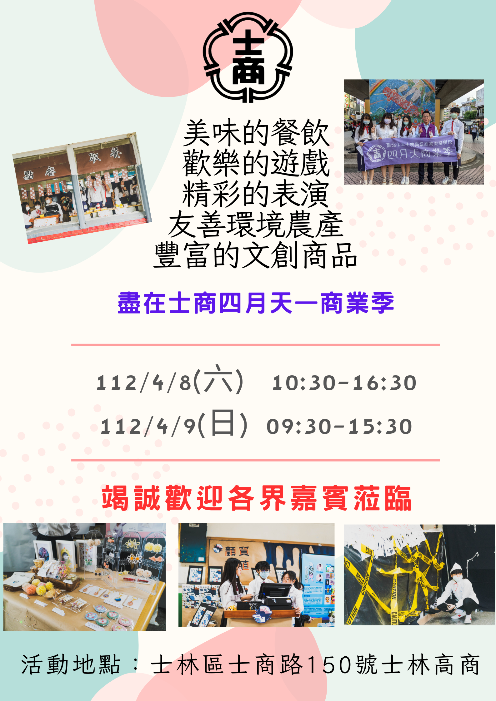 二、本校將於112年4月8日、9日辦理「士商四月天商業季」,計有餐飲業、新住民特色商店、傳統農漁特產、文創市集等22間商號進行營業,周邊更有許多精彩配套活動,如北市各高中職社團精彩表演等,並搭配廣設科學生美展、門市服務科愛心義賣、與科大攜手合作各式體驗課程等,活動精采多元。