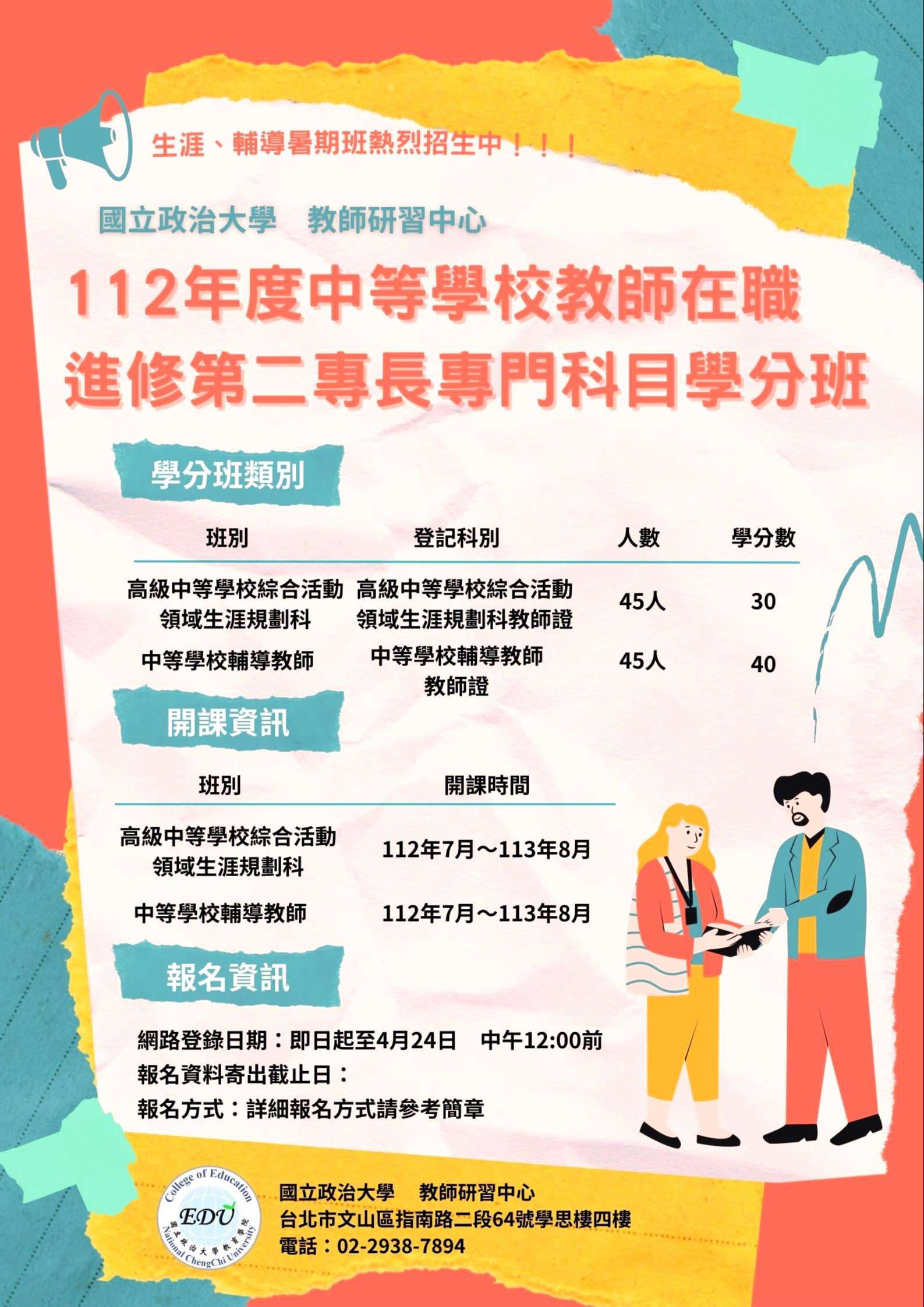 六、正班及隨班附讀網路報名登錄至112年5月19日(星期五) 下午1時止,詳細資訊請參閱所附簡章內容或至該校教師研習中心網頁(http://tisec.nccu.edu.tw)查詢。聯絡電話:(02)2938-7894。