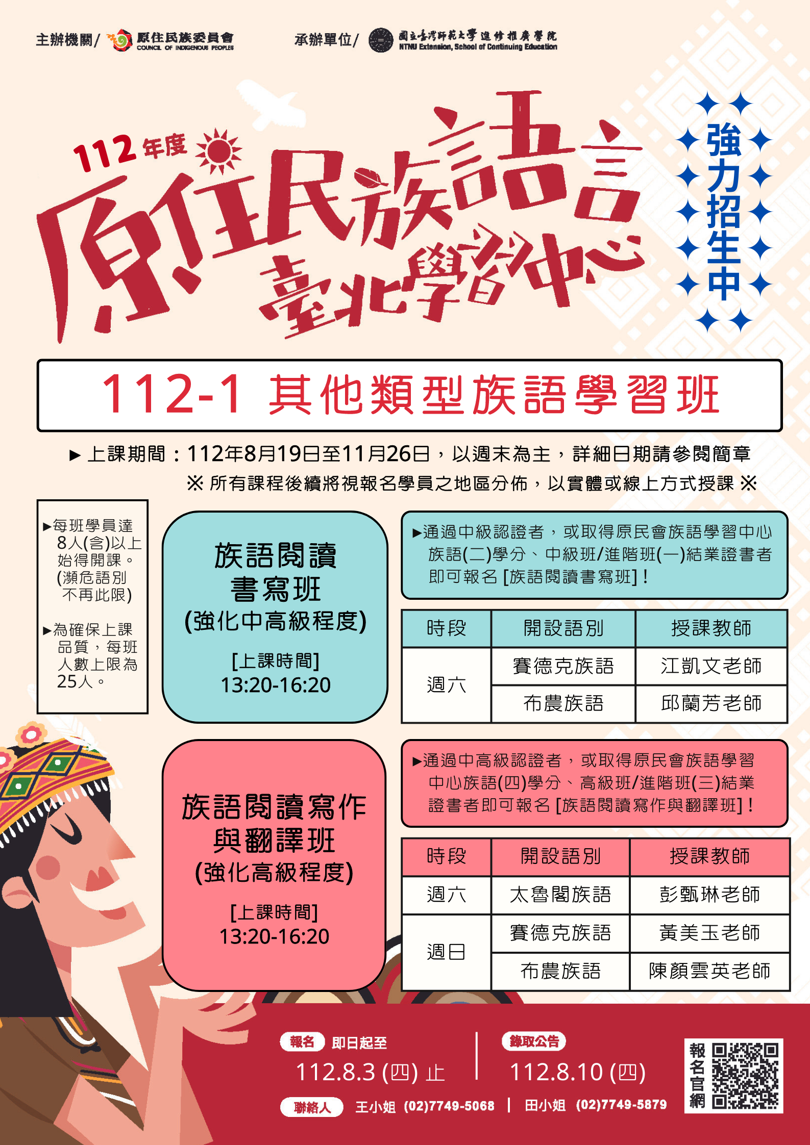 三、旨揭專班招生對象針對有意願學習原住民族文化及語言, 並欲參加原住民族語言能力認證之中高級或高級應試者, 報名期間自即日起至112年8月3日(星期四)中午12時止, 相關招生訊息及報名資訊,請參考附件或至網站查詢 (https://ntnucamp.sce.ntnu.edu.tw/allc/news/)。