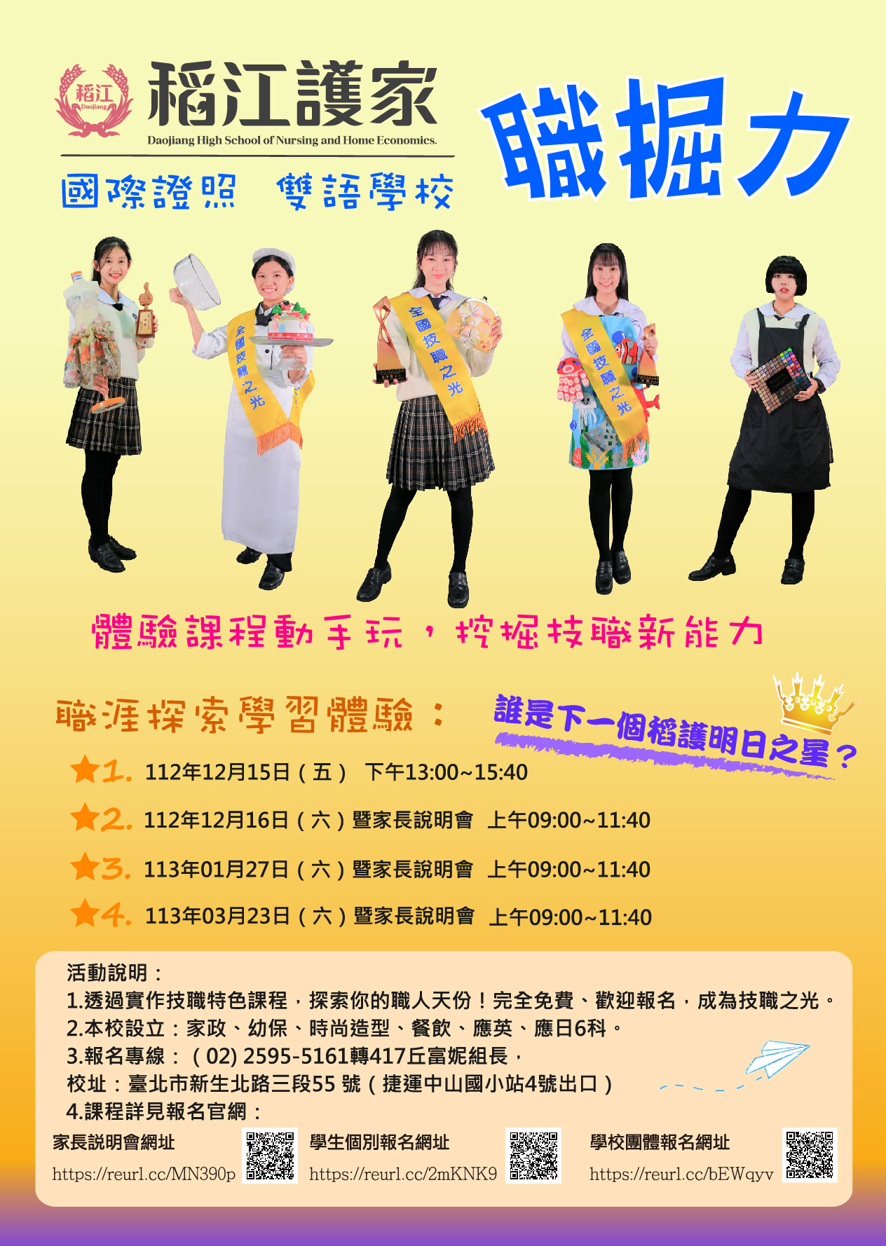 二、本學期於112年12月15日(五)、12月16日(六)、113年1月27日(六)、113年3月23日(六)辦理「稻江護家職掘力實作體驗」,誠摯邀請 貴校八、九年級學生參加,並歡迎 貴校教師或學生家長共同參與。