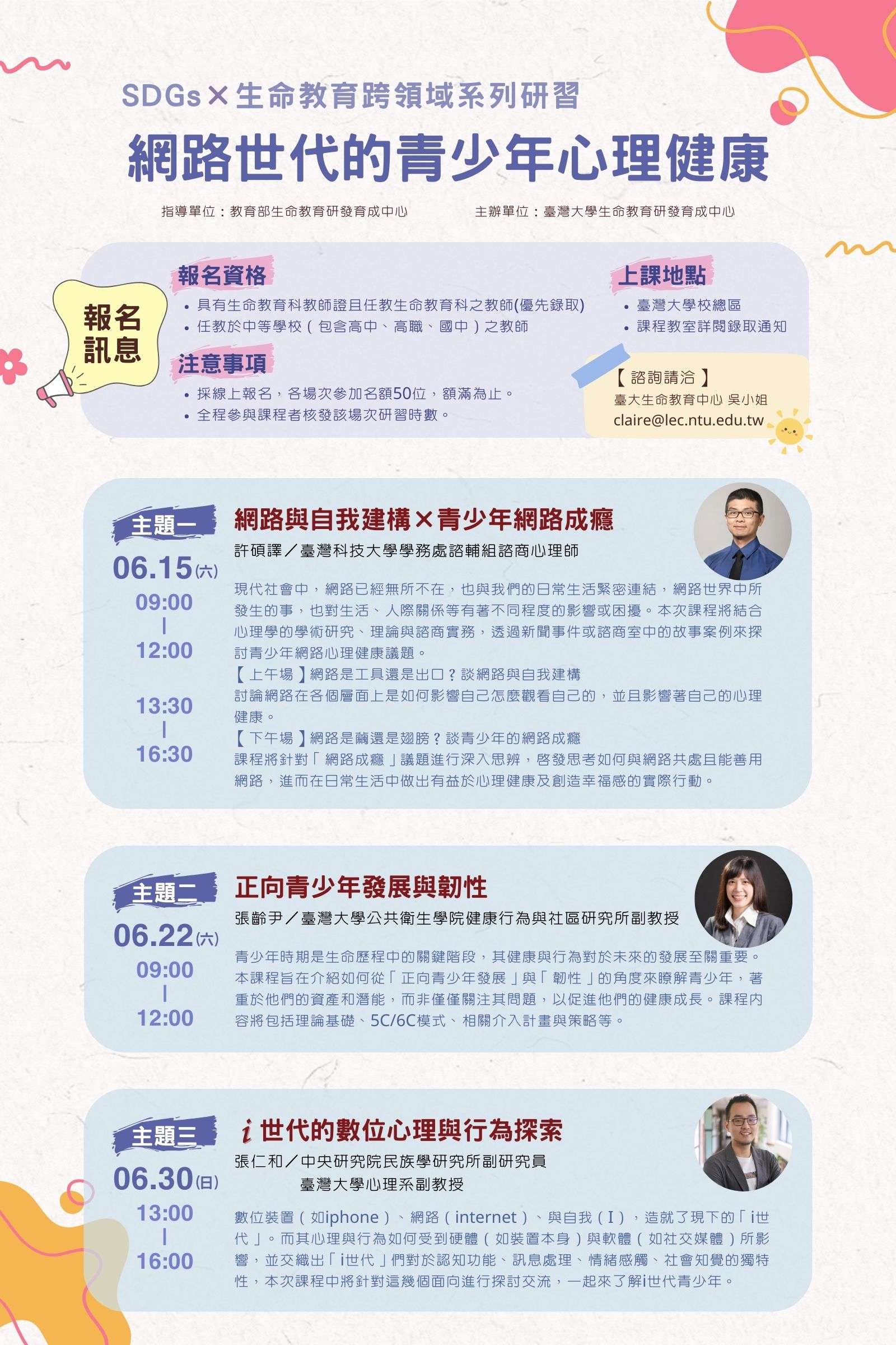 二、本研習規劃3個場次,詳細內容請參閱簡章或官網。