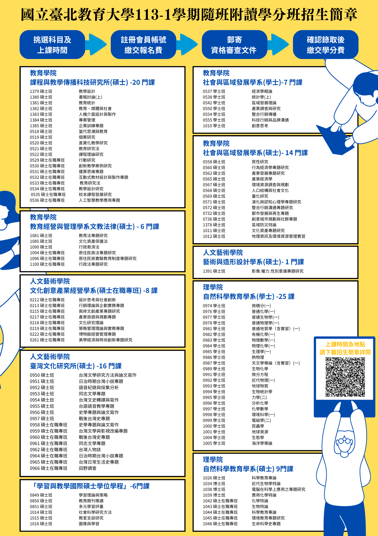 二、開課日期:113年9月9日開課,詳見招生簡章及本校校務整合資訊系統,點選訪客->數位服務->公開課表查詢 (選 擇113-1學期)->勾選開放隨班附讀課程(https://nsa. ntue.edu.tw/ )。