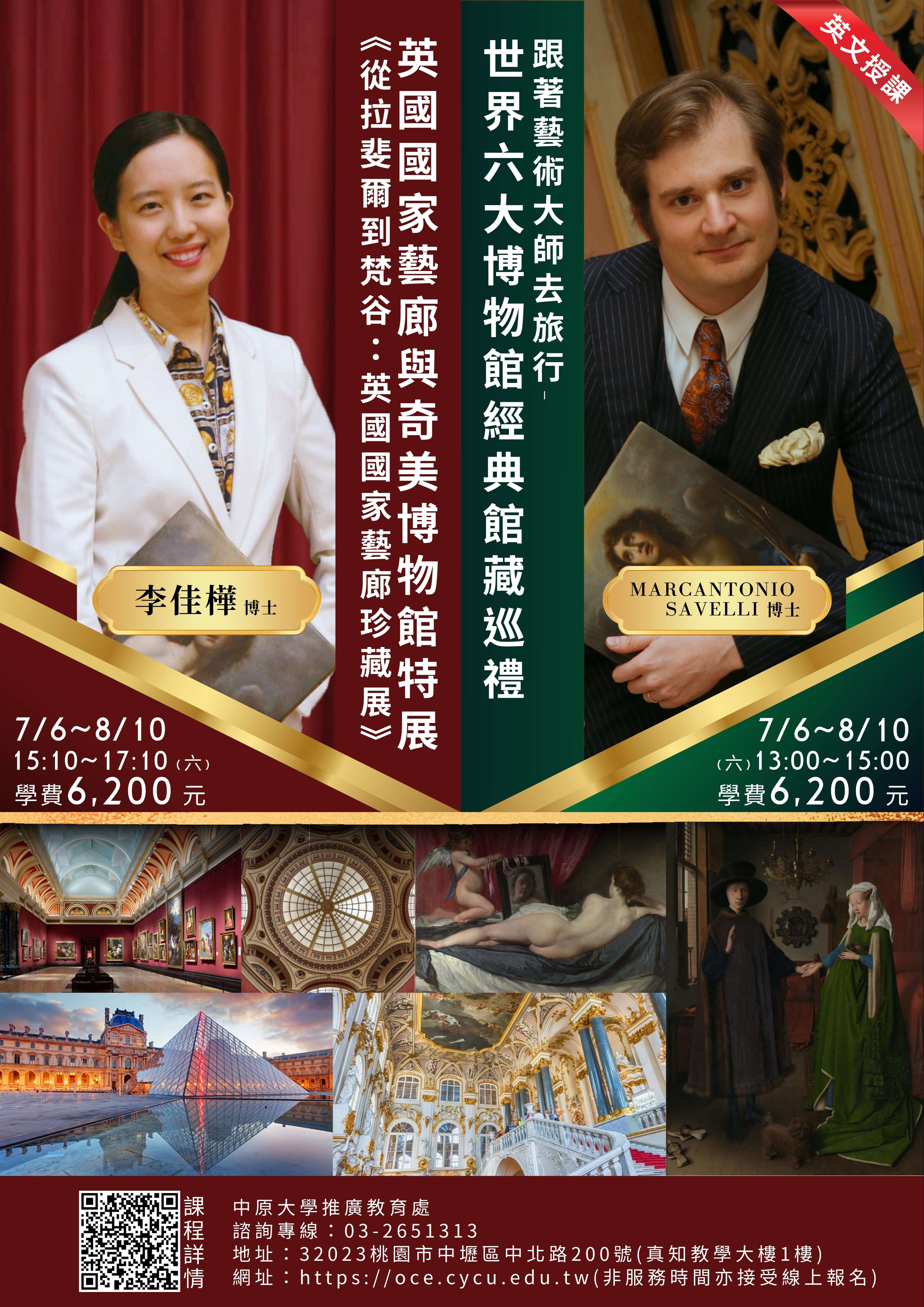 (一)「跟著藝術大師去旅行-世界六大博物館經典館藏巡 禮」:113年7月6日至8月10日每星期六13時至15時。