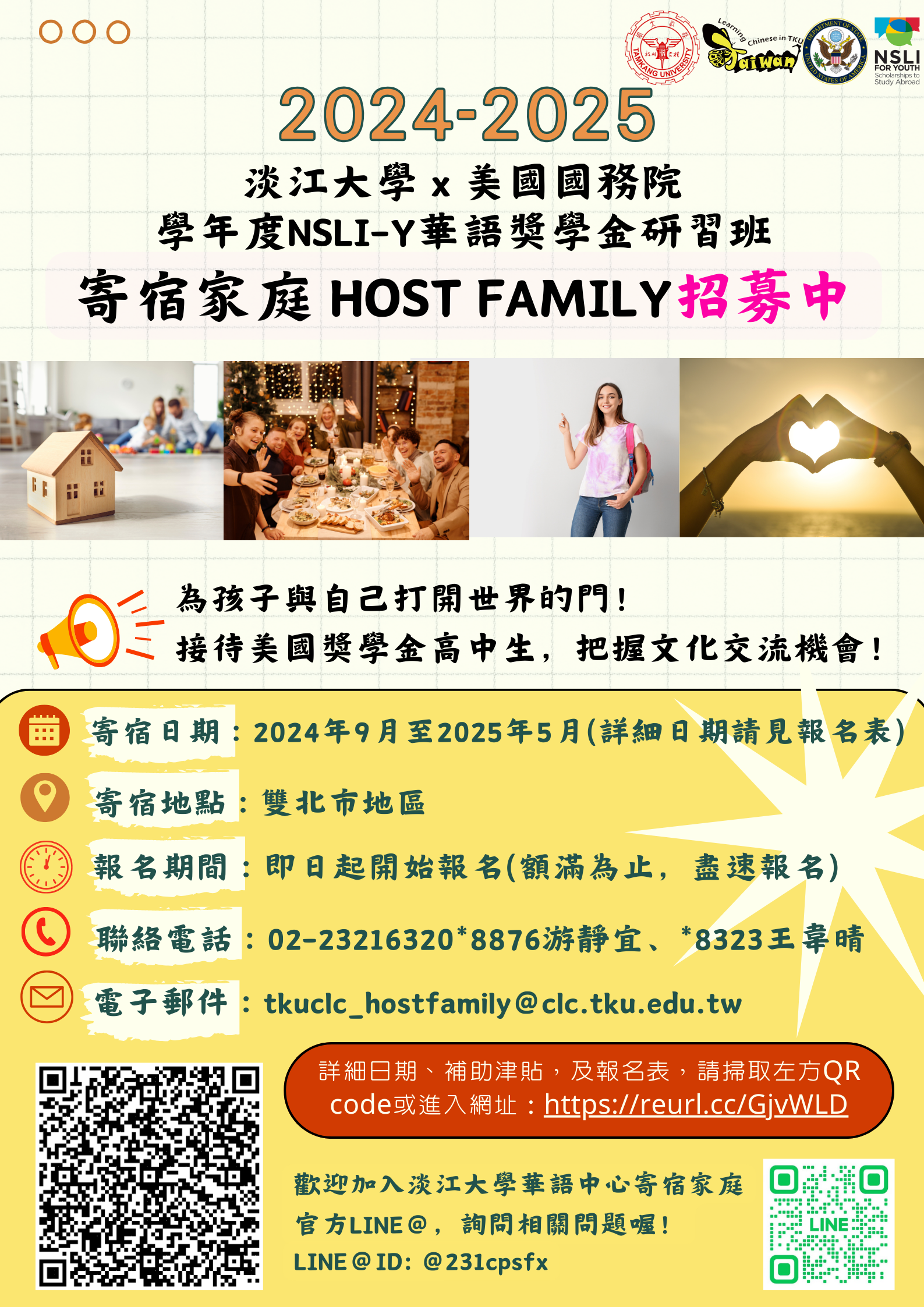 (一)寄宿期間:自113年9月14日至114年5月11日的周末、寒假、春節假期及國定假日等非上課時間。(備註:實際日期仍須視美方確定可入臺時間,再行調整。)