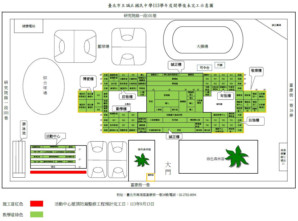 因本校活動中心屋頂防漏整修工程目前尚在進行,施工廠商已於工地架設圍籬,本校並於相關集會告知全校學生勿靠近工地,以免發生危險!敬請您協助再次提醒貴子弟,工程預計於9/13完工,學校亦會督促施工單位儘快完成,造成不便,敬請見諒!若您有任何問題,請撥打總務處電話27828094分機1500或1510,謝謝!