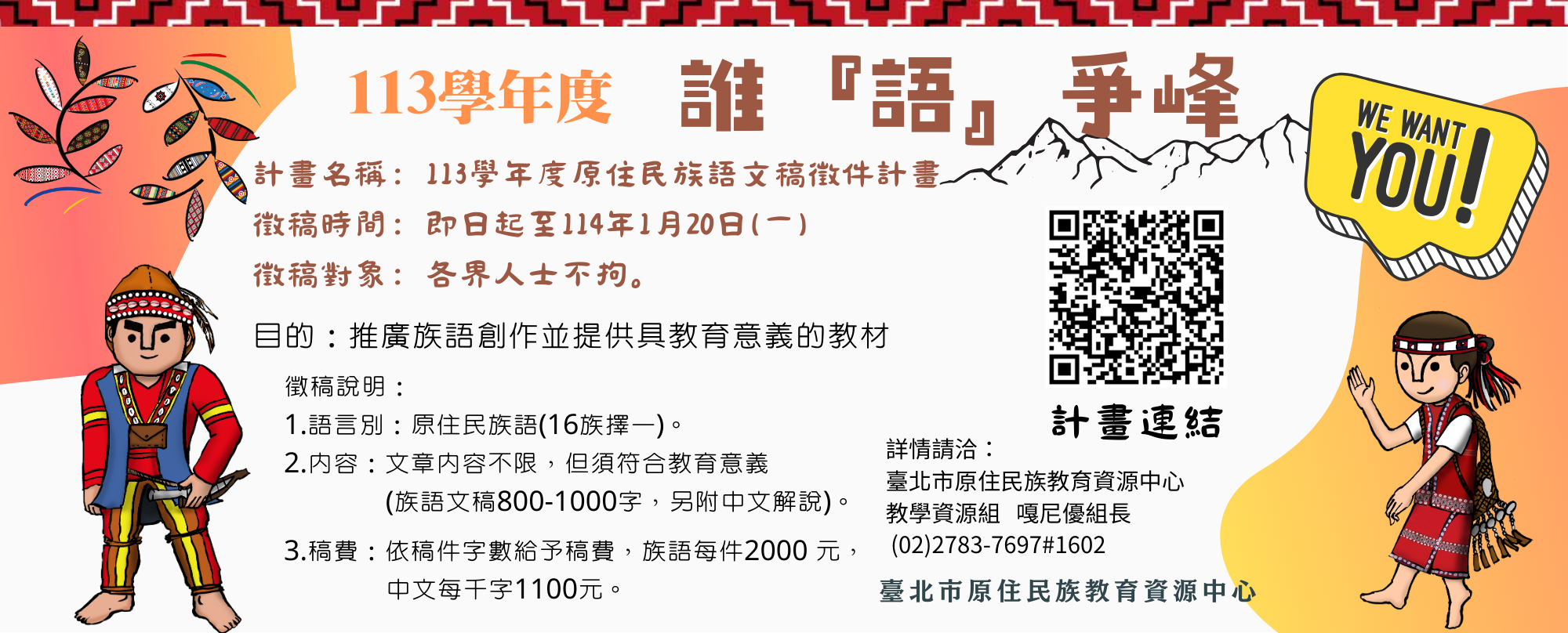2、內容:文章內容不限,但須符合教育意義(族語文稿 800-1000字,另附中文解說)。
