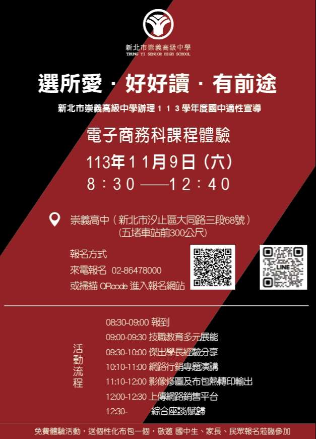 一、時間:113年11月09日(六):上午9時00分至12時40分 二、活動內容:以適性發展及最新相關升學管道為主,邀請家 長進入學校參觀(體驗)導覽活動。 三、活動地點:該校1F會議室。