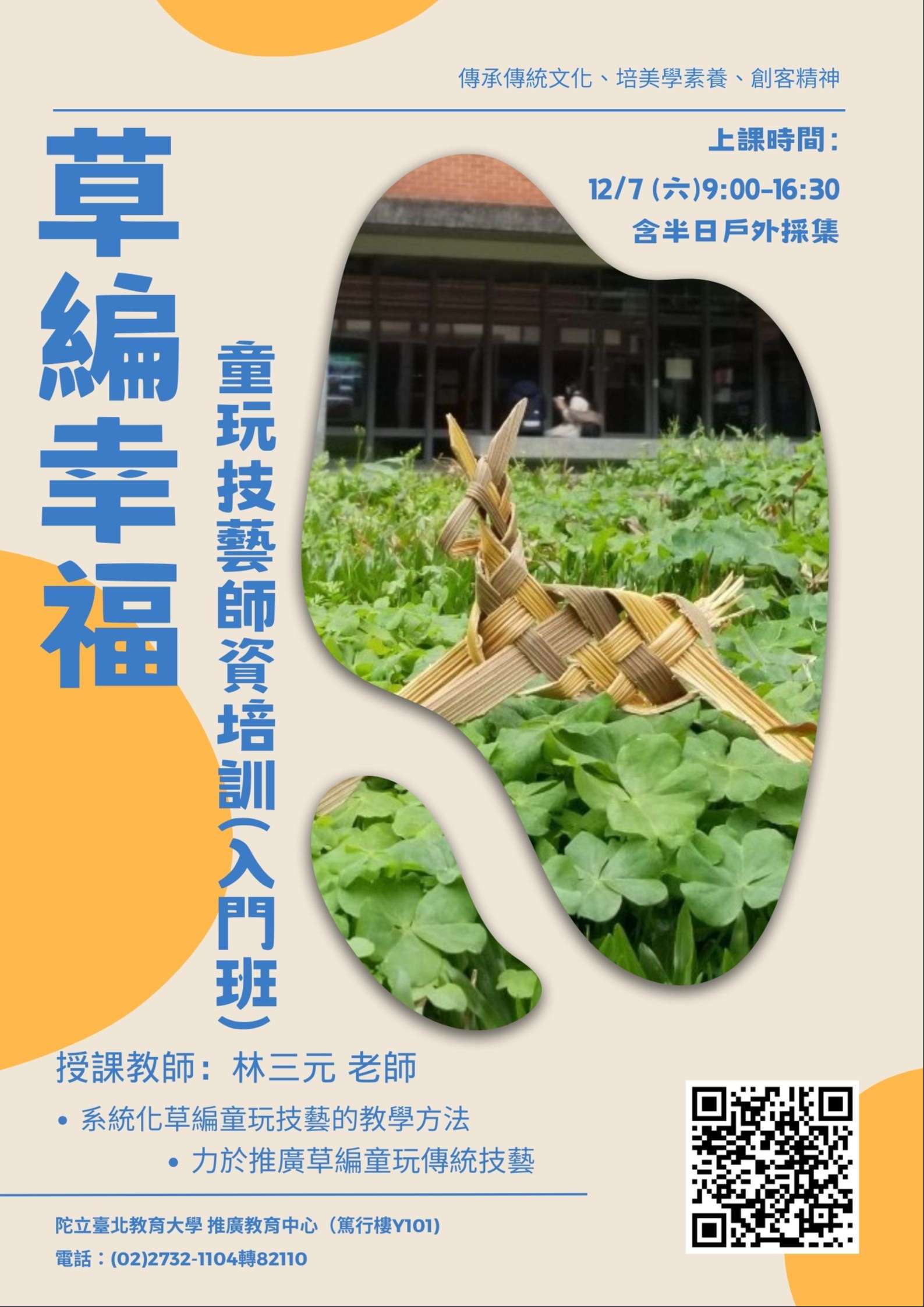 一、草編幸福-童玩技藝師資培訓(入門班):113年12月7日(六) 9:00-16:30共6小時,全勤並通過評核將核發研習證明書。 課程特聘專業草編達人「草編CEO林三元老師」親授,包含 戶外採集、戶外與教室型態的教學示範、草編文化歷史理 論介紹,豐富多樣的內容不藏私分享,歡迎18歲以上對草 編童玩有興趣之教師或一般民眾報名。