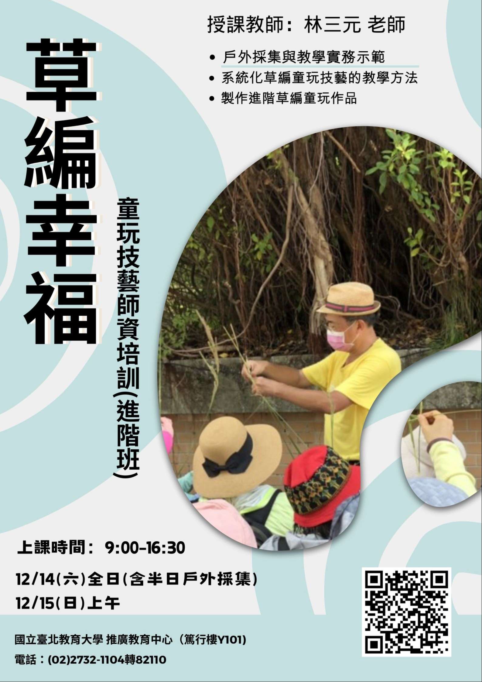 二、草編幸福-童玩技藝師資培訓(進階班):113年12月14日 (六)及12月15日(日)共9小時,全勤並通過評核將核發研習 證明書。課程特聘專業草編達人「草編CEO林三元老師」親授,包含戶外採集、戶外與教室型態的教學示範、教學計 劃撰寫、教學經驗分享等,歡迎18歲以上對草編童玩有興 趣之教師或一般民眾報名。
