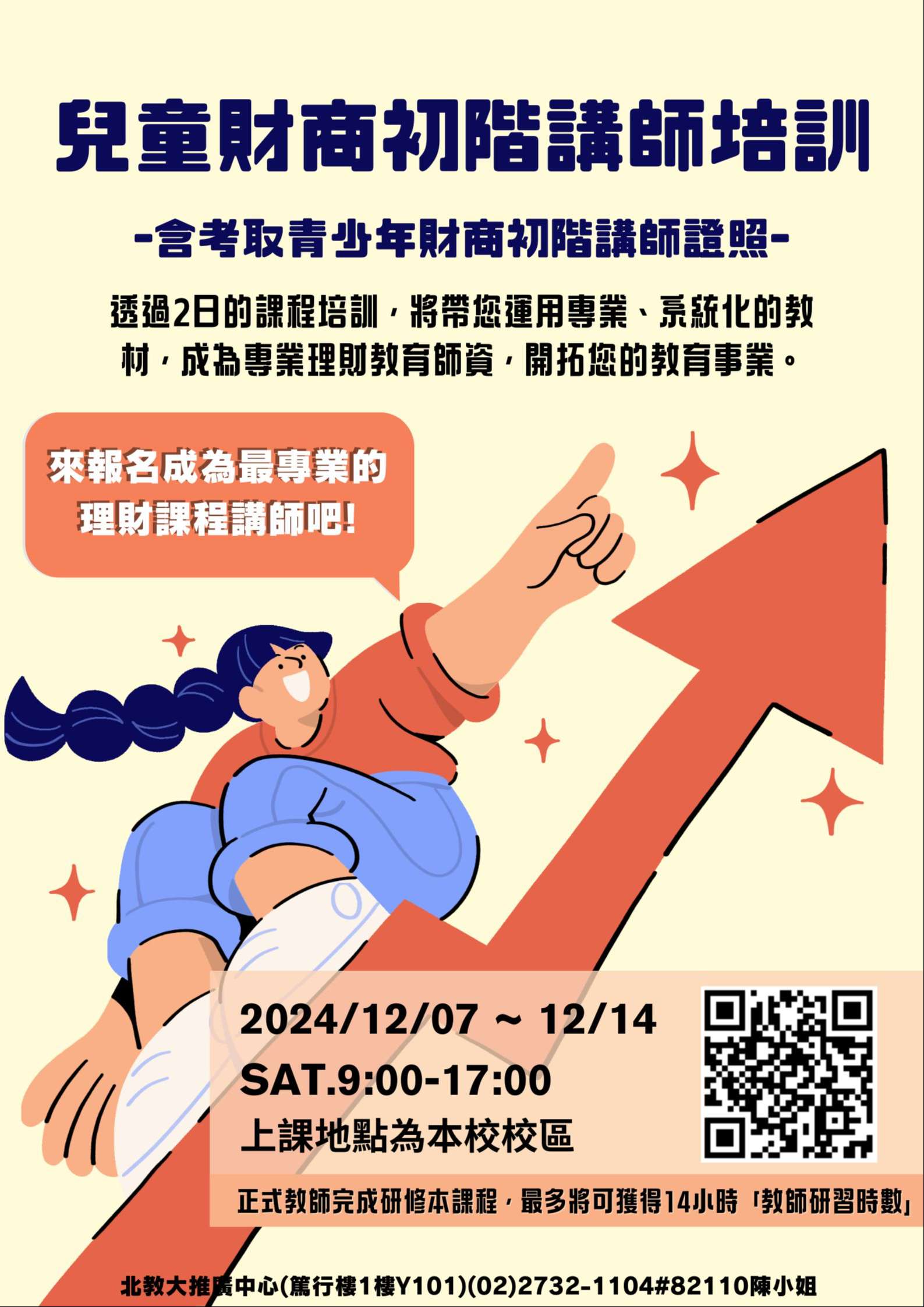 三、兒童財商初階講師培訓班:113年12月7日、12月14日週六 9:00-17:00共14小時,現場考取「青少年財商初階講師證 照」。在學之大學生或研究生、教育及培訓機構教師、對 「兒童財商教育」有興趣之社會人士皆可報名。