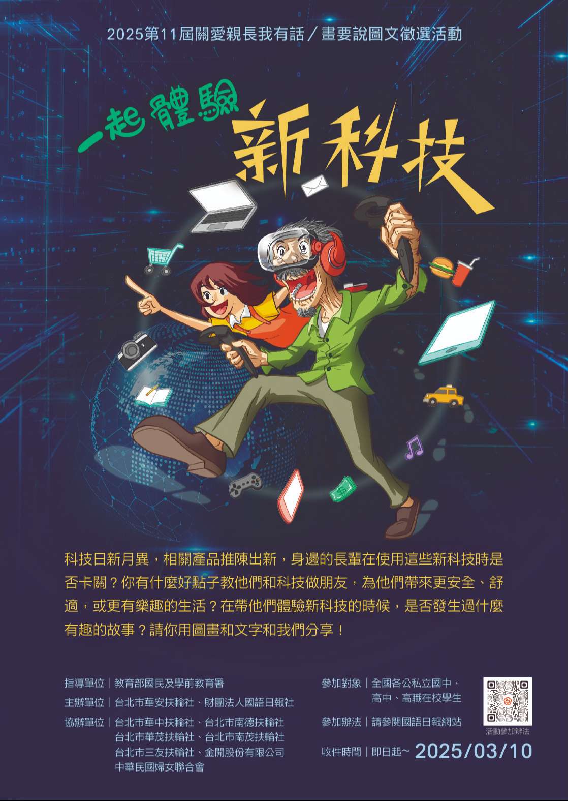 二、為鼓勵高級中等學校及國民中學學生勇於表達對親長的關 愛,財團法人國語日報社與臺北市華安扶輪社共同辦理第 11屆「關愛親長 我有話/畫要說」圖文徵選活動。