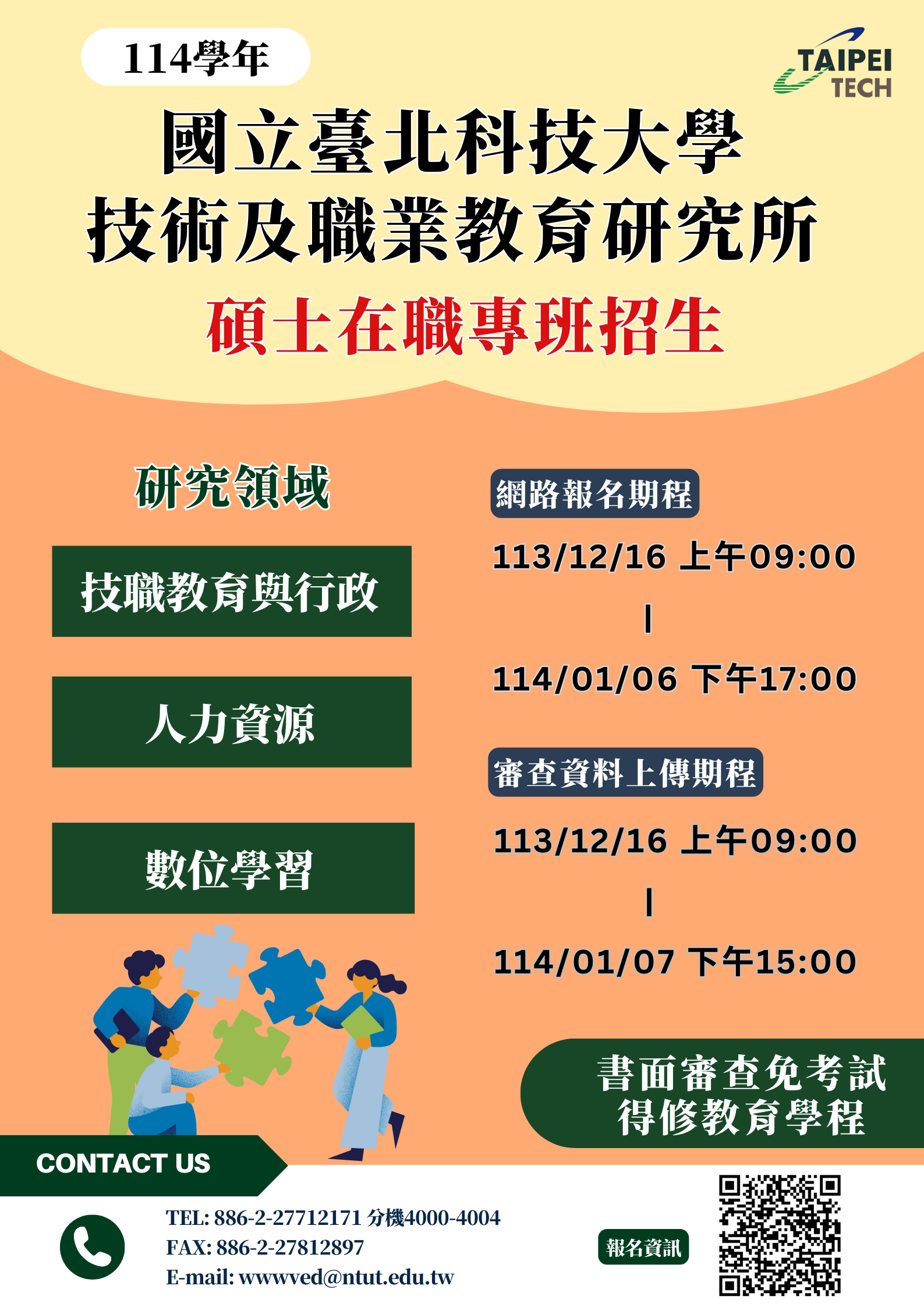 網路報名登錄日期與時間:113年12月16日(星期一) 09:00 起至114年1月6日(星期一)17:00止。報名資料上傳截止日 期與時間:114年1月7日(星期二)15:00,詳情參閱 https://aps2.ntut.edu.tw/ceo/New。