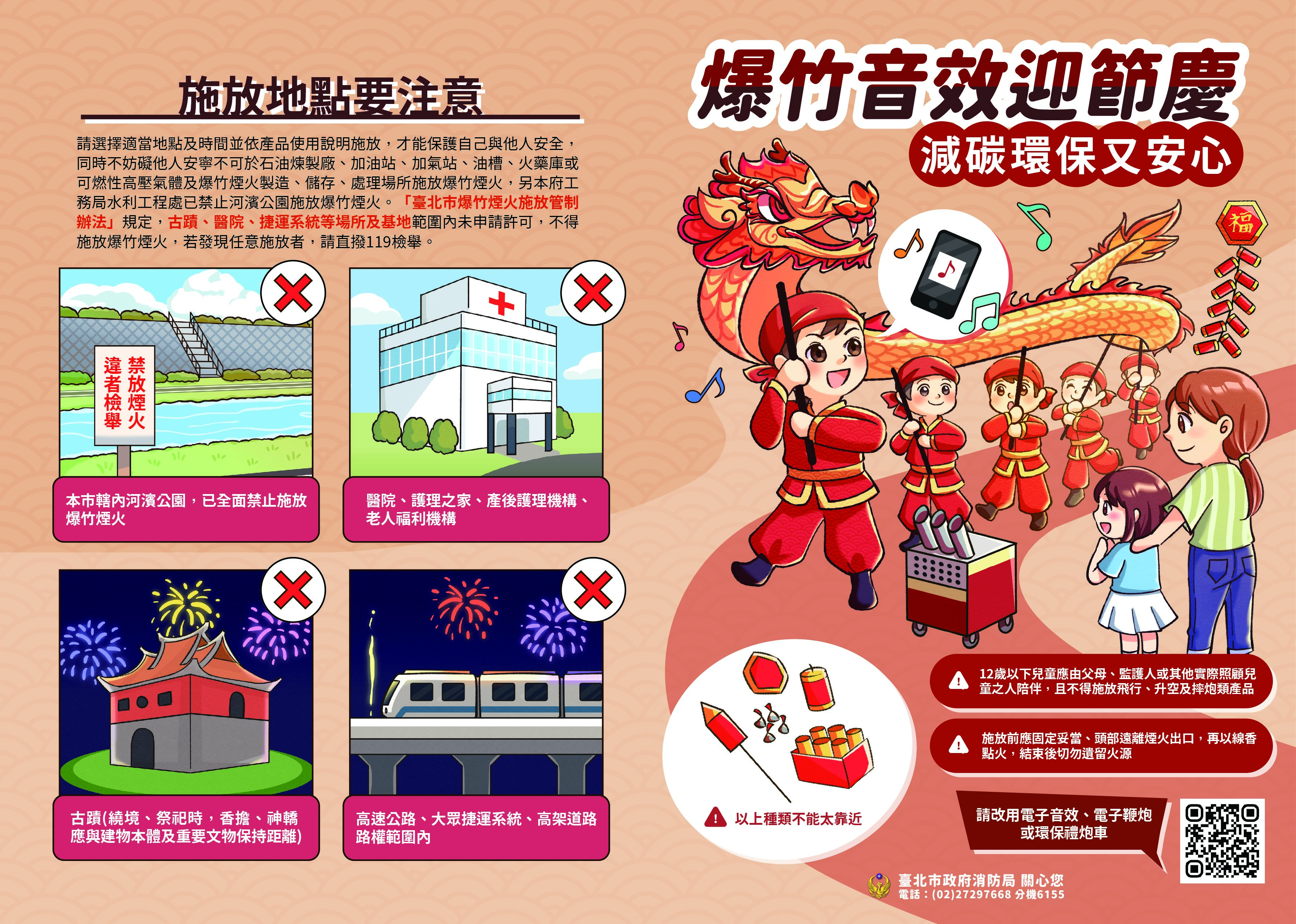 四、「臺北市爆竹煙火施放管制辦法」已規範高速公路、大眾 捷運系統及高架道路路權範圍內、古蹟、醫院、護理之家、產後護理機構及老人福利機構等場所及基地範圍內, 不得施放爆竹煙火,請協助宣導以電子鞭炮或爆竹音效替 代傳統爆竹燃放,爆竹燃放音效可至本府消防局網站 https://reurl.cc/M6MK14下載使用。
