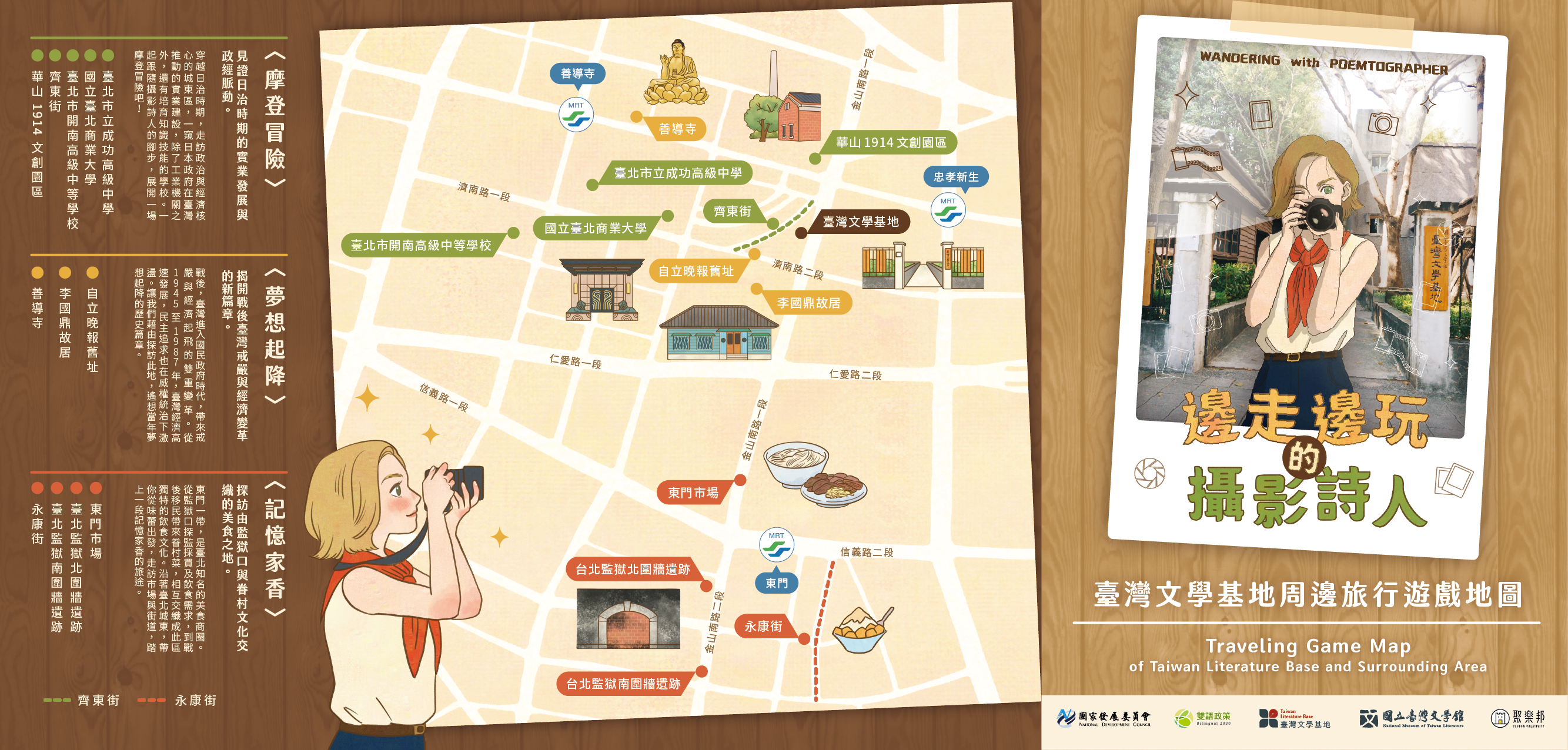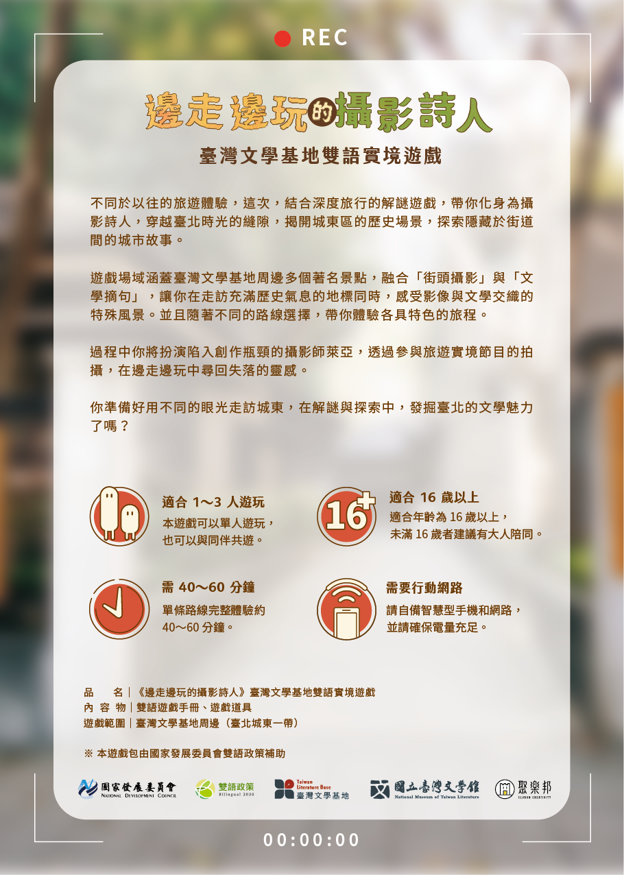 三、預約參加英語導覽者,可獲贈「臺灣文學基地雙語實境遊 戲包」。遊戲包內含解謎遊戲手冊,旨在引導使用者探索 城東地區文化資產,並透過雙語內容融合英語與華語學習 元素。