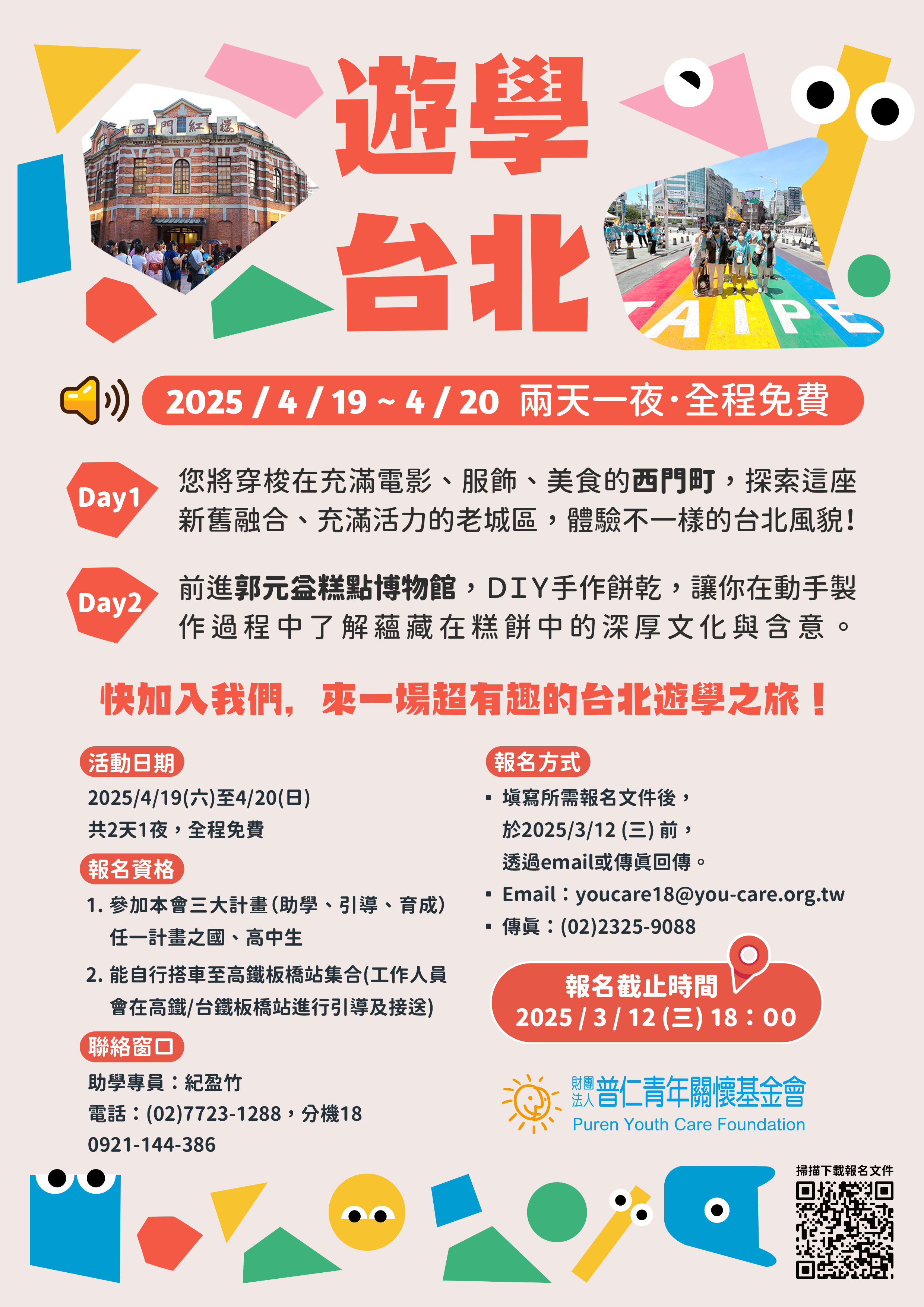 一、該會將於2025年04月19日(六)至04月20日(日),舉辦2025 年遊學台北青少年體驗活動,費用全免,凡參與本會助學 計畫、引導計畫或育成計畫之國、高中生皆可報名。(含 2025年7月開始受助學生)