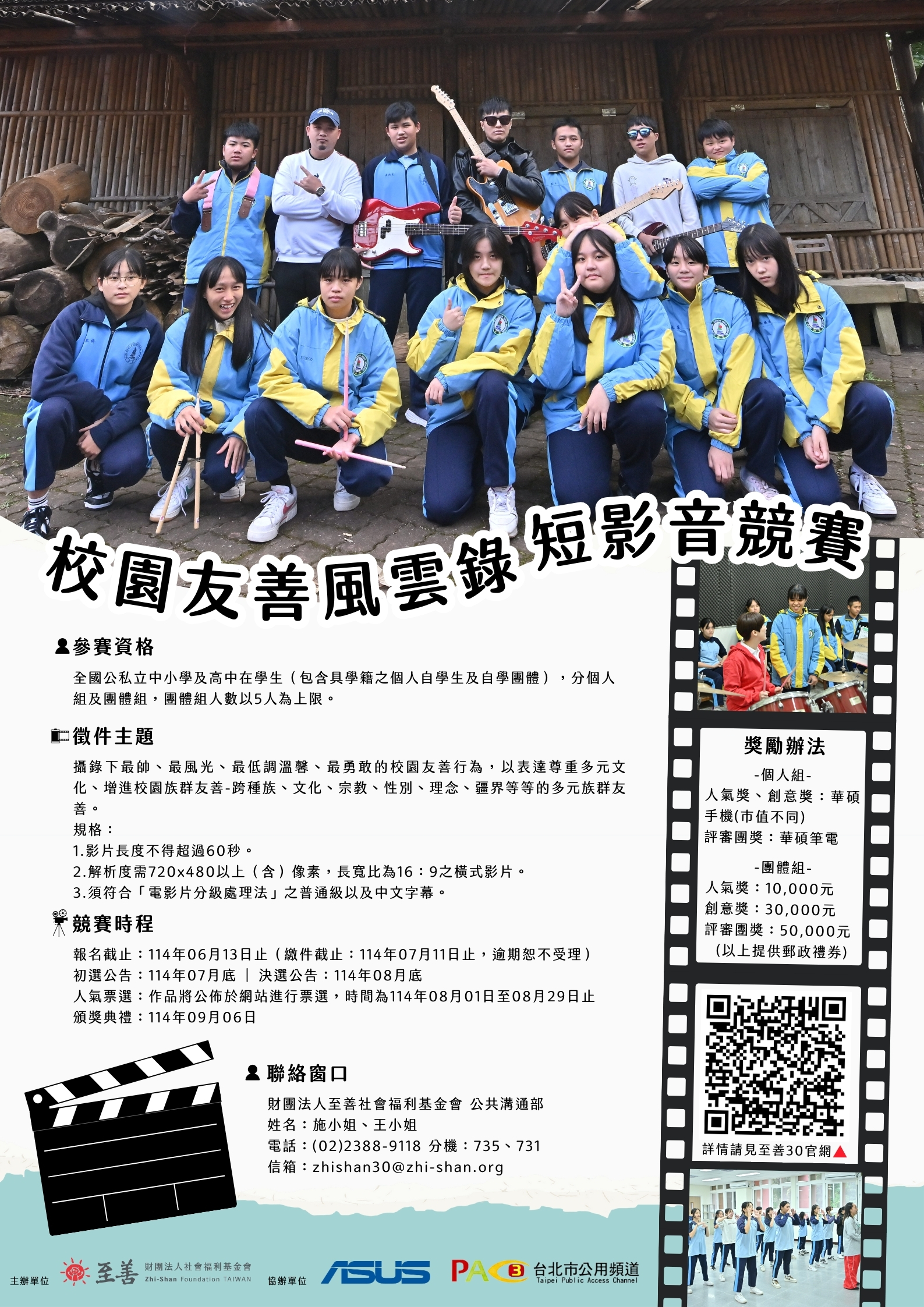 二、該基金會(官網:https://www.zhi-shan.org/)長期從事 亞洲4地兒少發展工作,為響應「兒童權利公約」(CRC) 中禁止歧視原則,自2023年起倡議「校園族群友善」,已 連續兩年舉辦校園族群友善獎。該會將辦理「校園友善風 雲錄-短影音競賽」,邀請全國國小至高中學生共同參 與,促進校園友善。 三、旨揭徵件活動簡章,摘述重點如下: