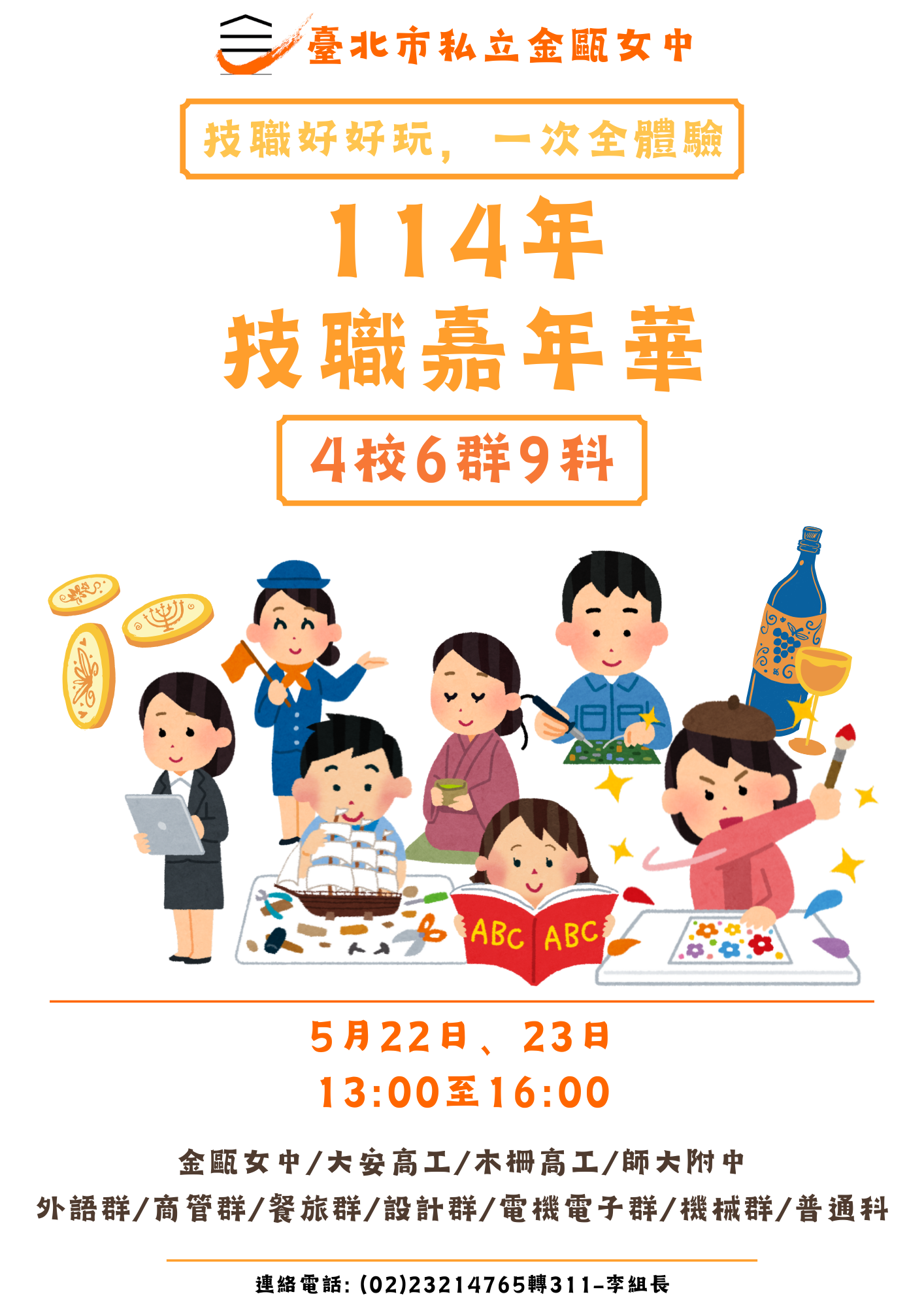 商管群、餐旅群、設計群、電機電子群、機械群等活動。