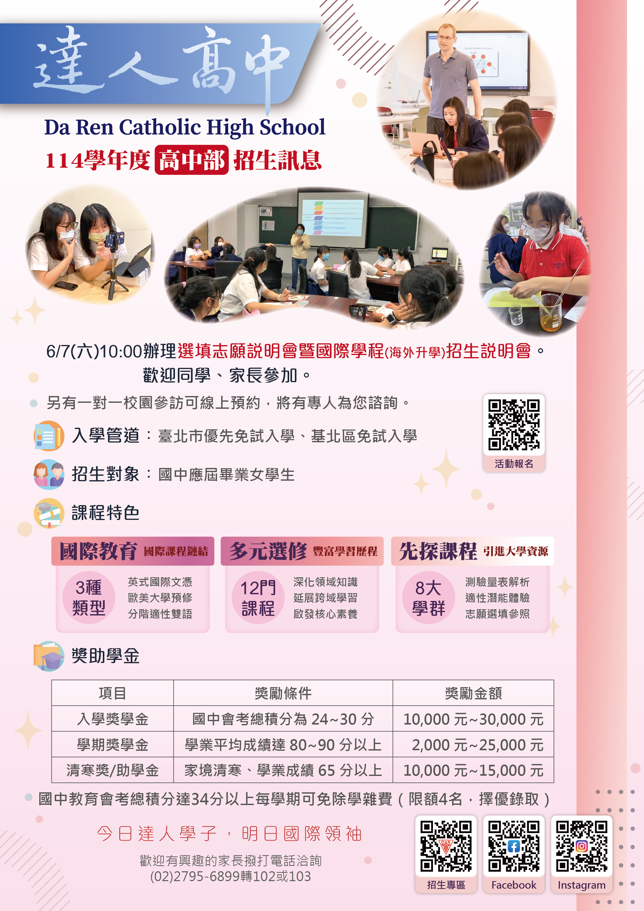 三、貴校訂於6月7日(星期六)上午10時辦理志願選填說明會暨國際學程(海外升學)招生說明會,歡迎九年級女學生及家長踴躍報名參加,活動報名連結:https://reurl.cc /vQLzll。