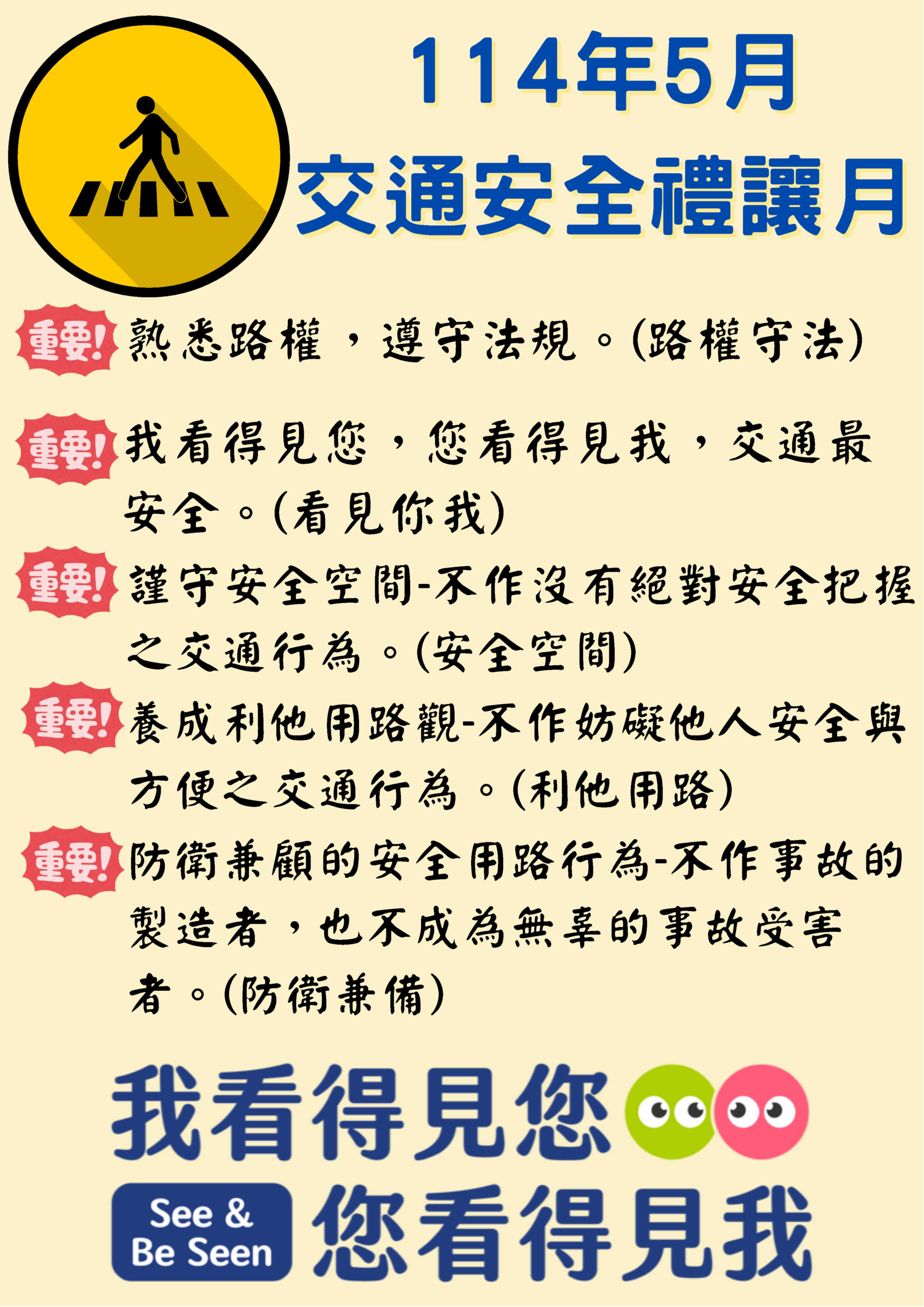 二、114年度交通安全禮讓月活動主題訂為「See & Be Seen 我 看得見您,您看得見我」,活動實施期間於114年5月1日 (星期四)起至5月31日(星期六)止。