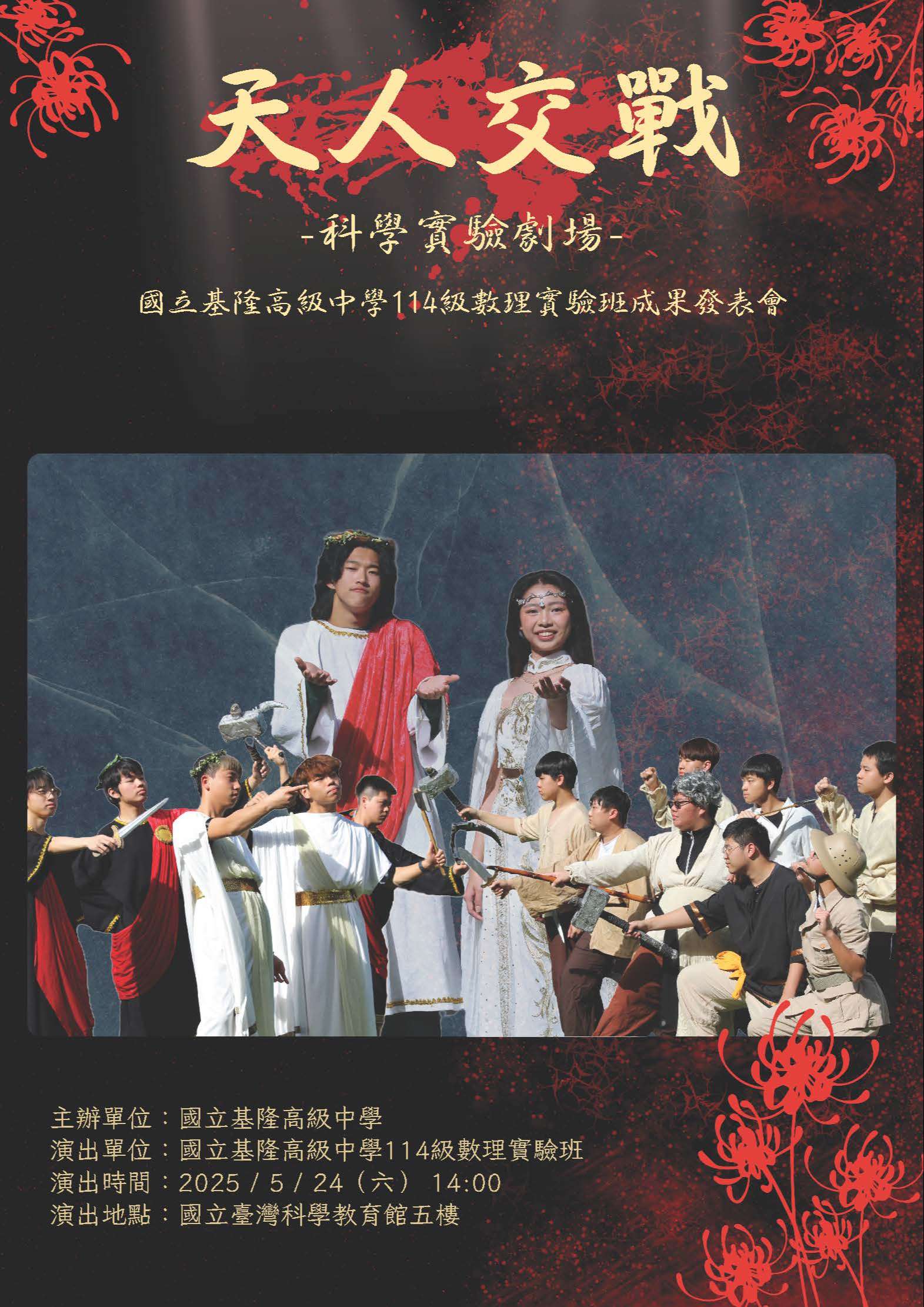 (三)活動特色:1、STEAM素養導向:整合科學(S)、技術(T)、工程(E)、藝術(A)與數學(M)元素,強化學習動 機。 2、國高中跨階共學:深化學生對未來學習場域的認識, 降低升學焦慮。 3、沉浸式科學劇場:由高中數理班學生策劃演出,呈現 科學知識與創意融合的教育表演。