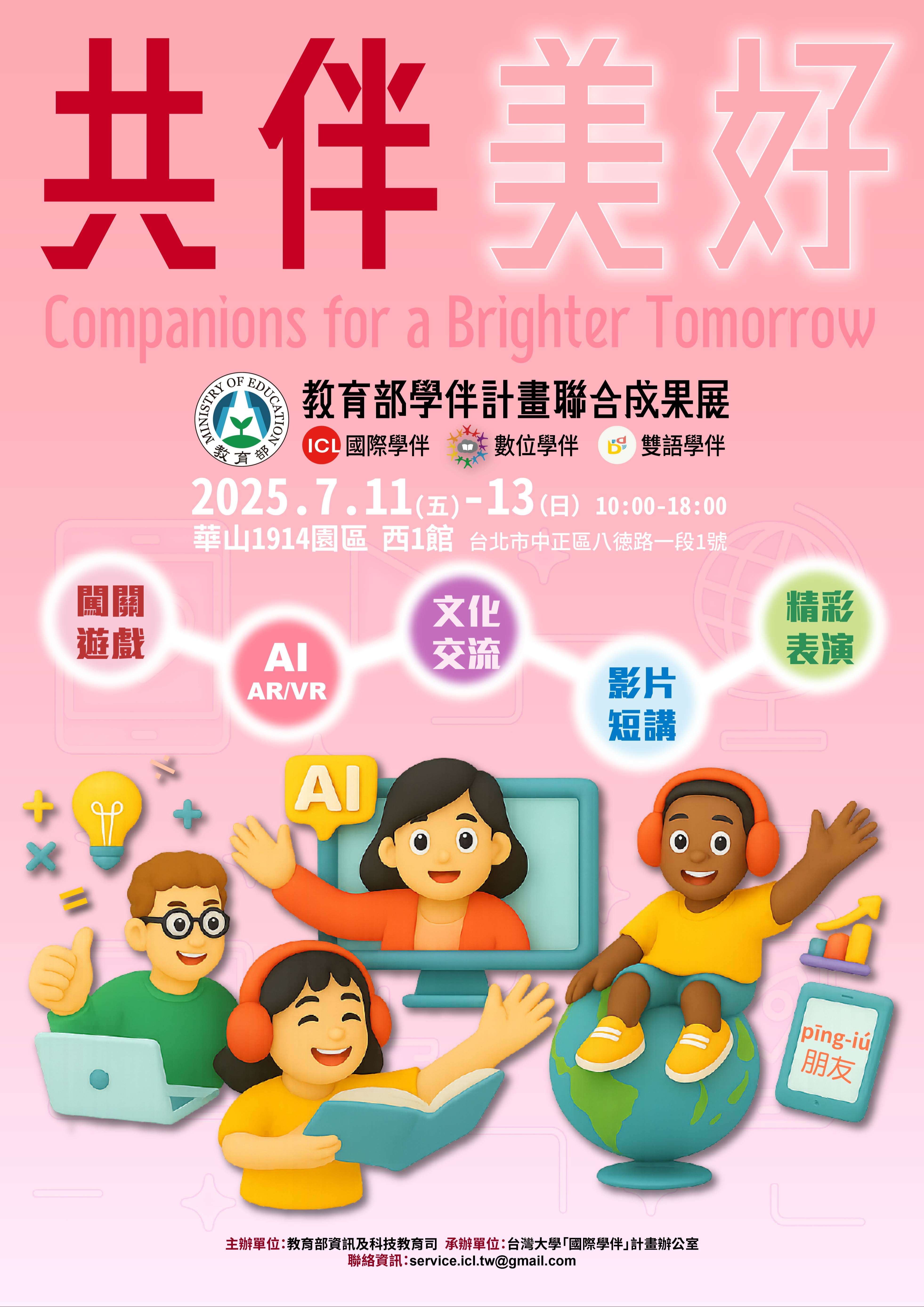 教育部推動「數位學伴計畫」、「國際學伴計畫」及「雙 語學伴計畫」成果豐碩,邀請學伴計畫團隊、AI相關計畫 及民間企業共同響應,辦理旨揭成果展,歡迎親師生免費 參觀,活動資訊摘要如下: (一)時間:114年7月11日(星期五)至7月13日(星期日)上 午10時至下午6時。 (二)地點:華山1914園區西1館(臺北市八德路一段1號)。 (三)活動內容:包含各計畫攤位展示、表演節目、數位課程 及生成式AI學習資源體驗、主題短講及闖關活動等豐富 內容。