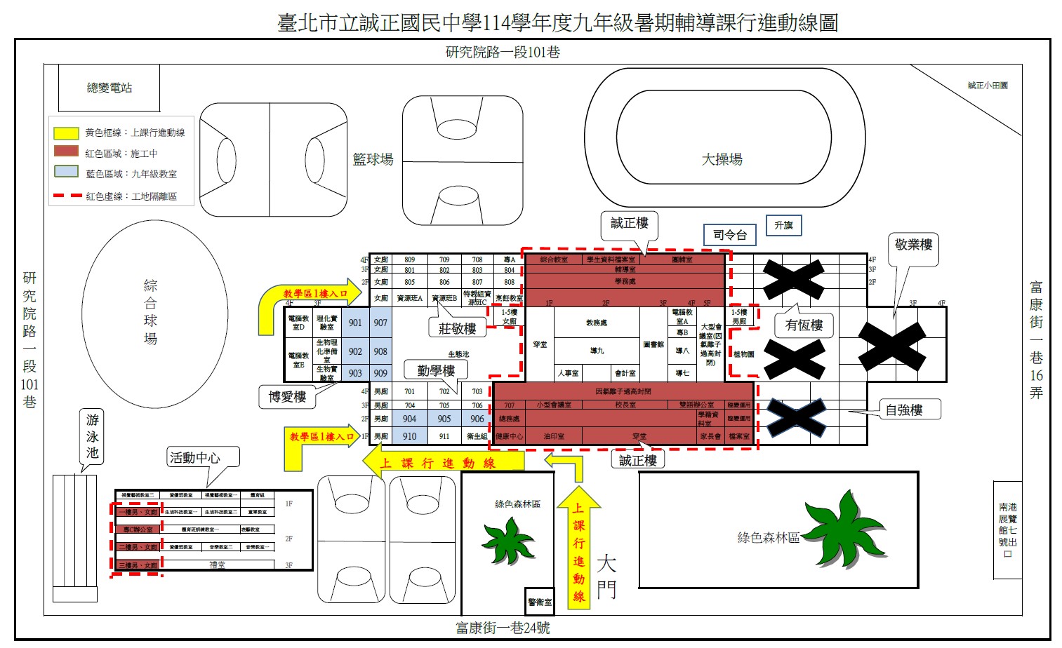 由於誠正樓進行耐震補強工程,請避開施工區域,改由勤學樓1樓連接走廊通道進入九年級教室,或由莊敬樓1樓進入教學區。造成不便,敬請見諒!
