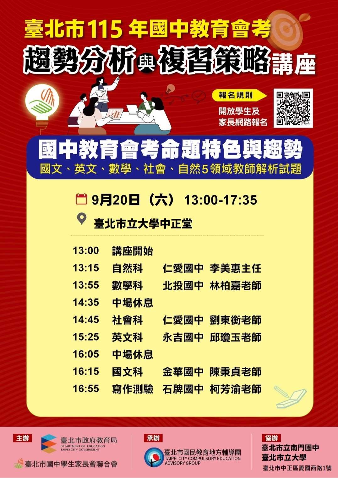 一、依據本局114年8月26日北市教視字第1143091780號函續 辦。 二、旨揭活動為本局參與主辦之年度重要教育活動,因報名踴 躍,原場地無法容納,為利活動順利進行,爰辦理變更活 動地點。 三、活動辦理相關資訊如下: (一)採實體演講方式:邀請國文(含寫作測驗)、英語、數 學、社會及自然5領域教師解析試題,並開放學生及家長 提問及雙向交流。 (二)活動對象:臺北市國中學生及家長(9年級優先、學生為 主,由於場地容量因素,僅限1為家長陪同)。 (三)活動時間:114年9月20日(星期六)13時起至18時止。(四)活動地點:臺北市立大學博愛校區中正堂。 (五)報名方式:由臺北市國中學生家長聯合會負責,請於114 年9月18日前至下列連結網址填寫報名表:http://docs. google.com/forms/d/e /1FAIpQLSdlzTLeQhZA6xVFLfbYFQYn64gSJPJwv0ldCGlzPH UKITFhvg/viewform,若有報名相關問題,請逕洽貴校學 生家長會。 (六)本次講座同步全程錄影,於活動結束後,上傳至臺北酷 課雲「酷課OnO線上教室」之「國中會考」專區,以提供 學生和家長觀看。
