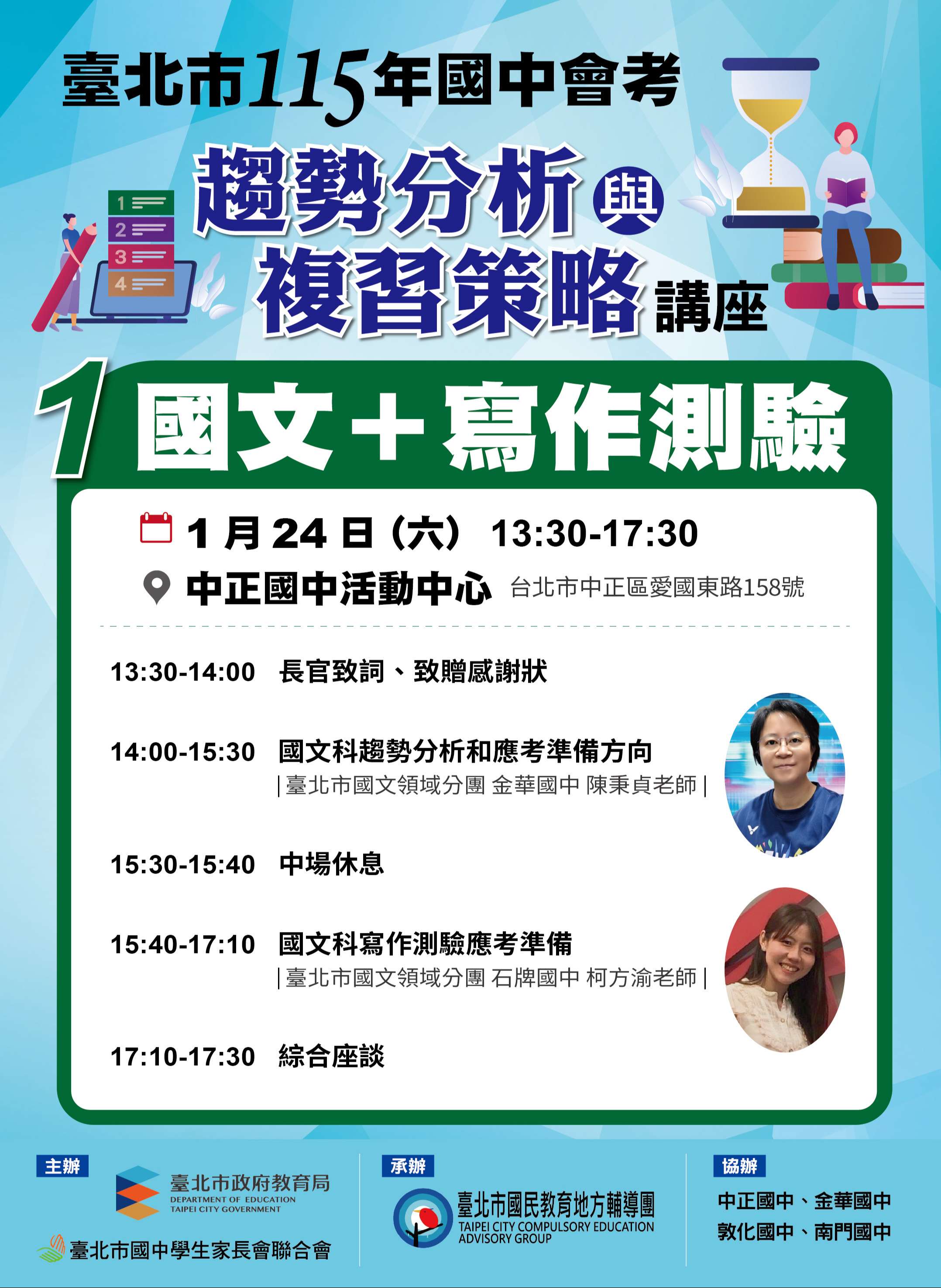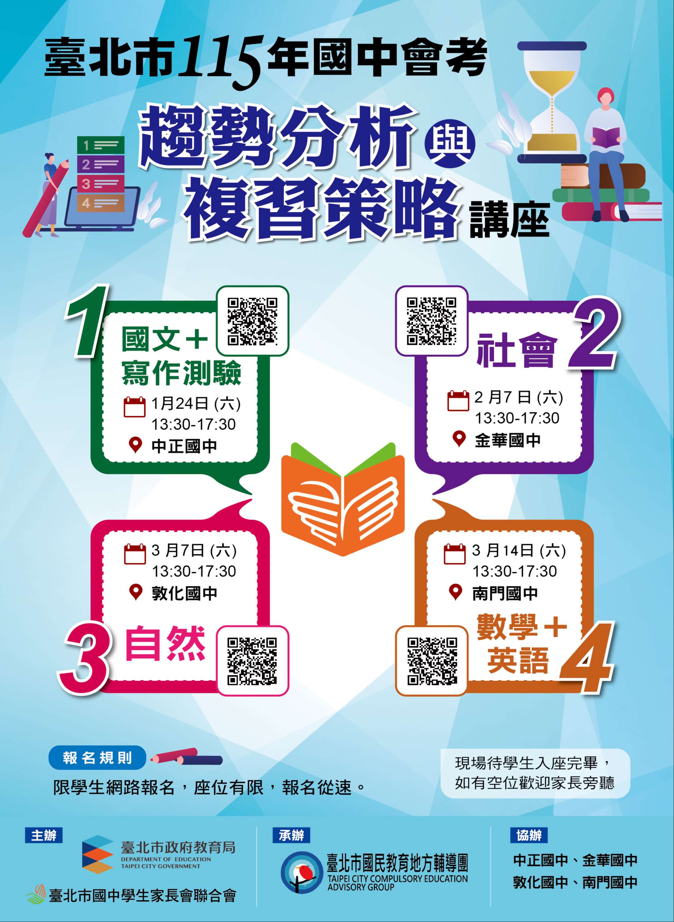二、為協助臺北市國中考生及家長瞭解115年國中教育會考命題特色與趨勢,本局會同臺北市國中學生家長會聯合會共同辦理旨揭講座。